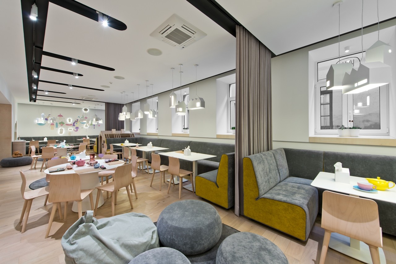 Si è convenuto che in un interno progettato per i bambini uno dei fattori più importanti è la luce, indispensabile per creare un’atmosfera calda e positiva. L’illuminazione si compone di due elementi: i corpi illuminanti decorativi – piccole sagome di case che pendono dal soffitto, disegnate appositamente per questo progetto, e fari funzionali accuratamente predisposti. Inoltre, la palette cromatica è stata scelta in modo che l’ambiente del ristorante diventasse un teatro neutro dove la presenza dei bambini e delle loro attività fosse l’elemento dominante. Le pareti, oltre che dalle case luminose, sono decorate da segni grafici che stimolano la curiosità e il pensiero creativo sia nei bambini sia negli adulti. Tutte queste caratteristiche hanno contribuito a creare l’atmosfera di una domenica mattina soleggiata, nonostante il ristorante occupi il piano terra di un antico palazzo in uno dei vicoli della città vecchia e nonostante il clima cupo di Vilnius.
