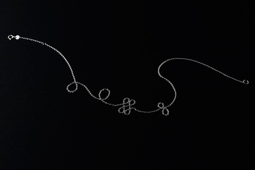 Nendo ha progettato la collezione di gioielli Single-stroke: sette modelli di collane e cinque orecchini disegnati con una catena in oro a dieci carati.