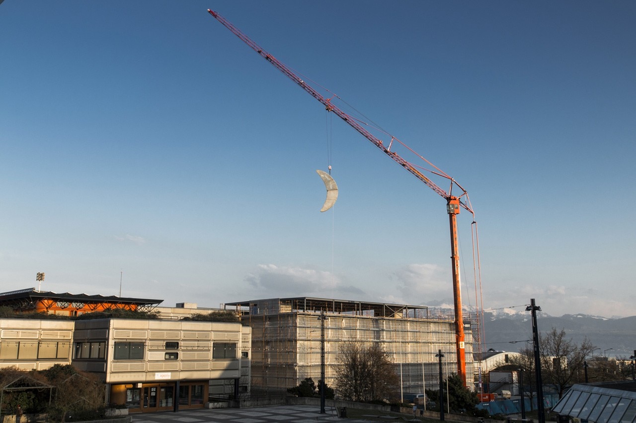 L’opera è parte del festival di Arte e Scienza organizzato dall’università EPFL di Losanna, in Svizzera. SpY è stato invitato a conoscere il mondo dell’università e si è divertito a vedere la reazione degli studenti quando la sera, usciti dall’università, hanno visto il campus illuminato da una grande luna.
