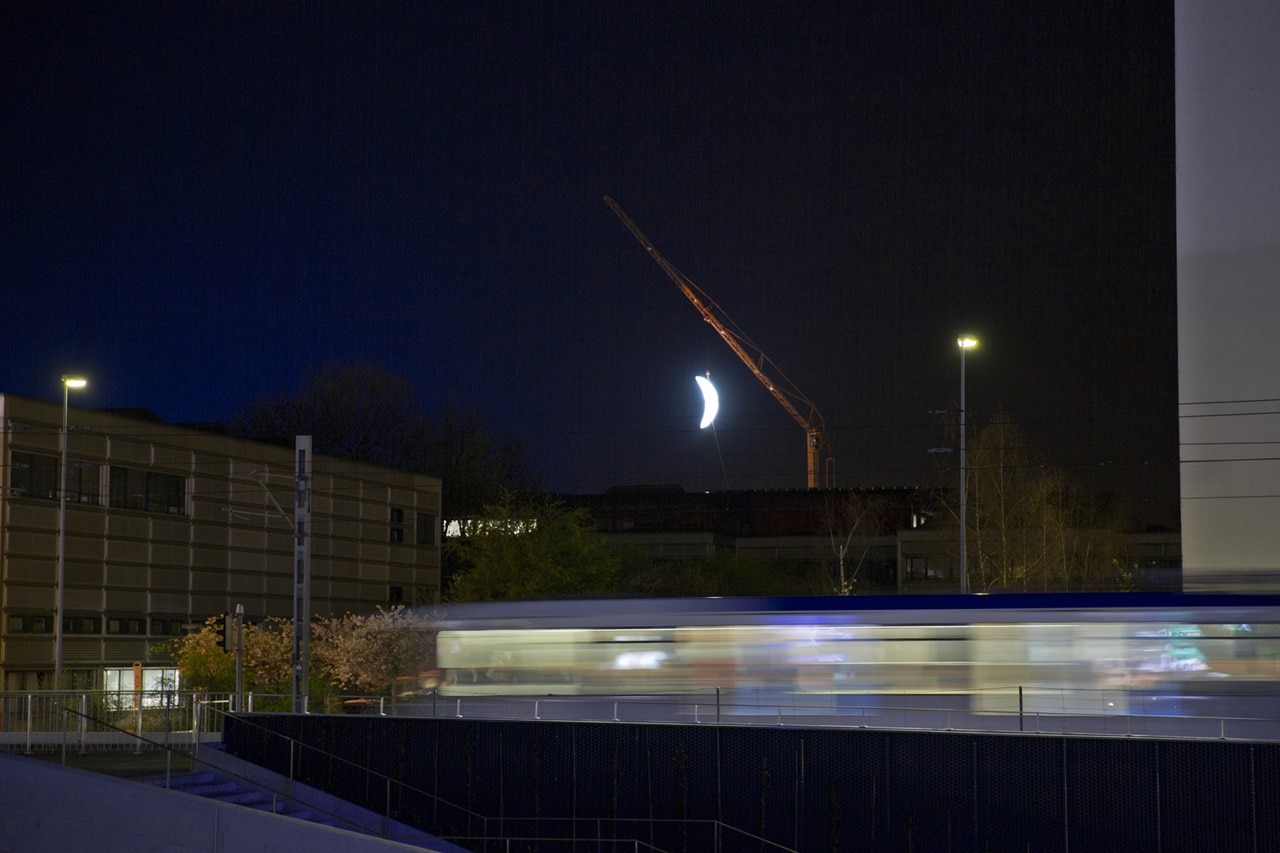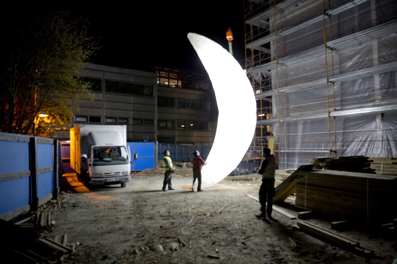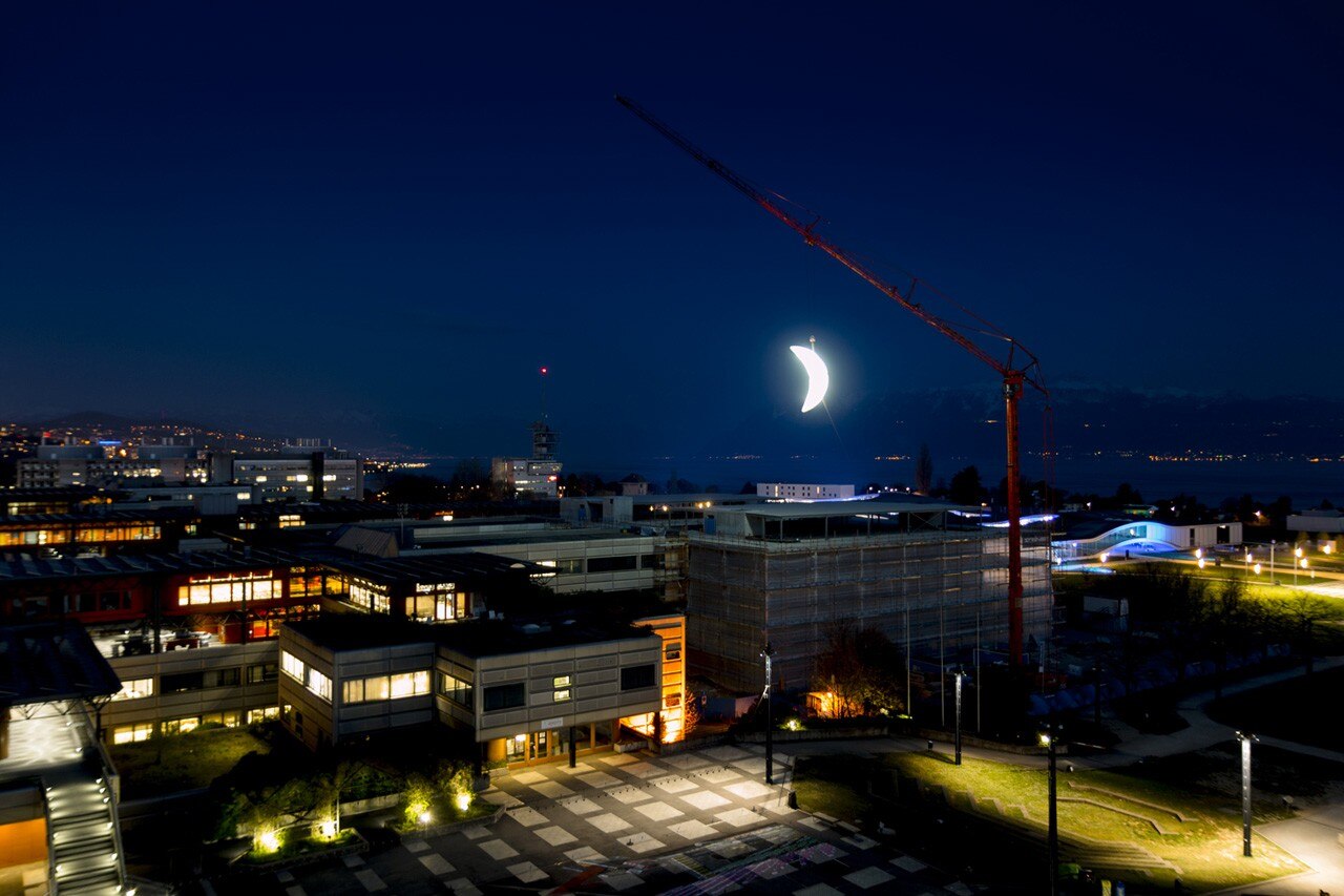 Nell'ambito del festival “Arte e Scienza” all’università EPFL di Losanna, l’artista urbano SpY ha appeso nel cielo il primo quarto luminoso di una grande luna.