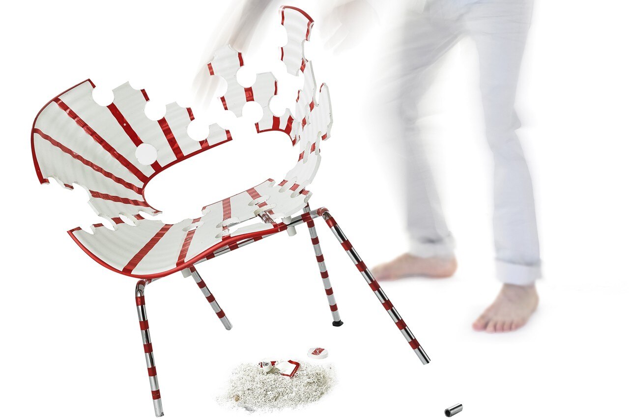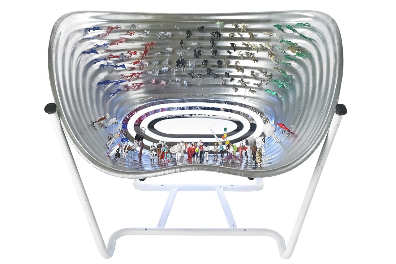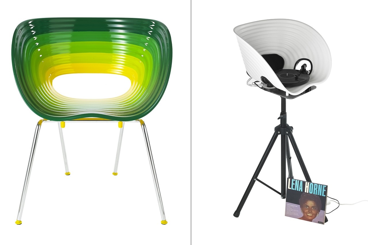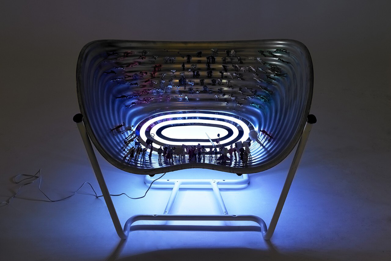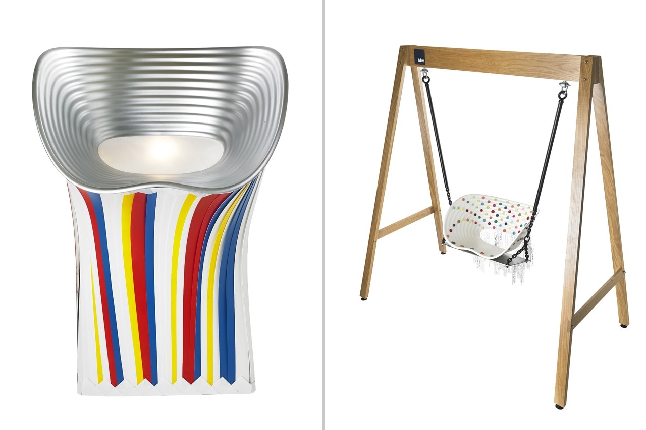 Left: El Ultimo Grito Studio, The Rise and Fall of the User. Right: Morag Myerscough & Luke Morgan, King of the Swingers