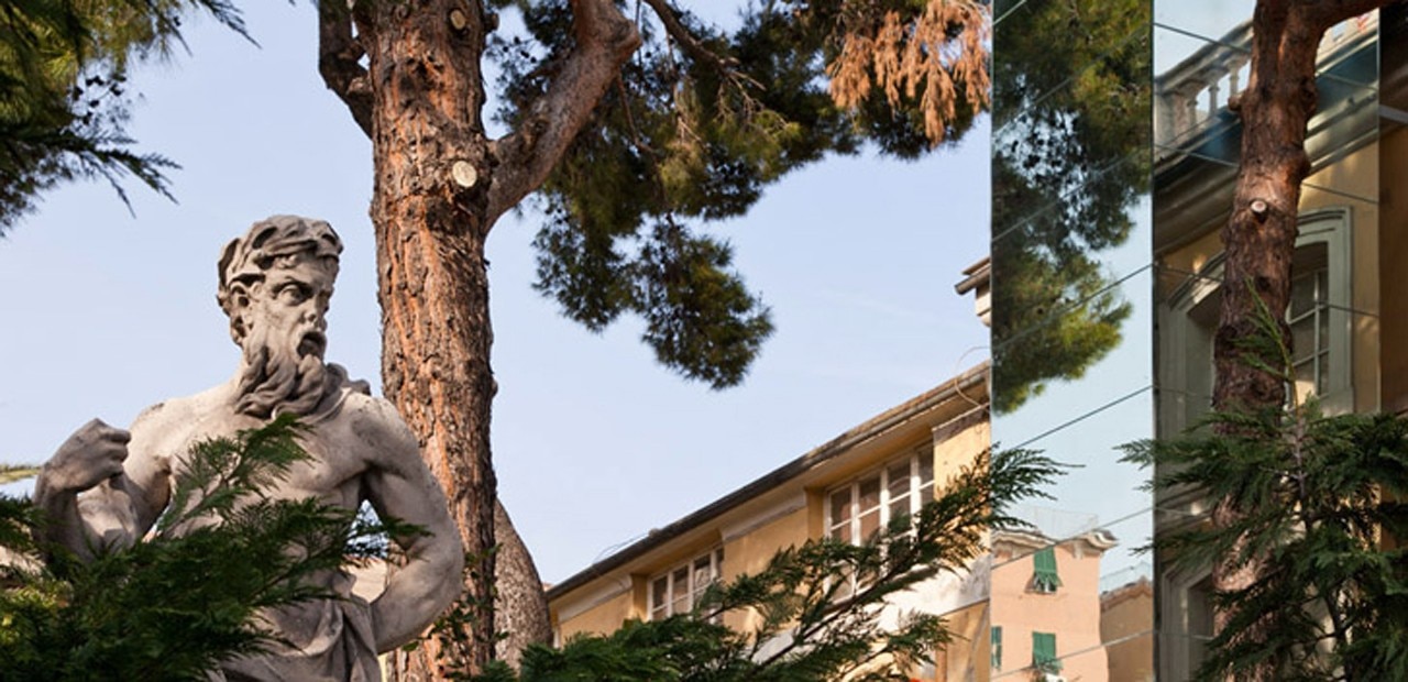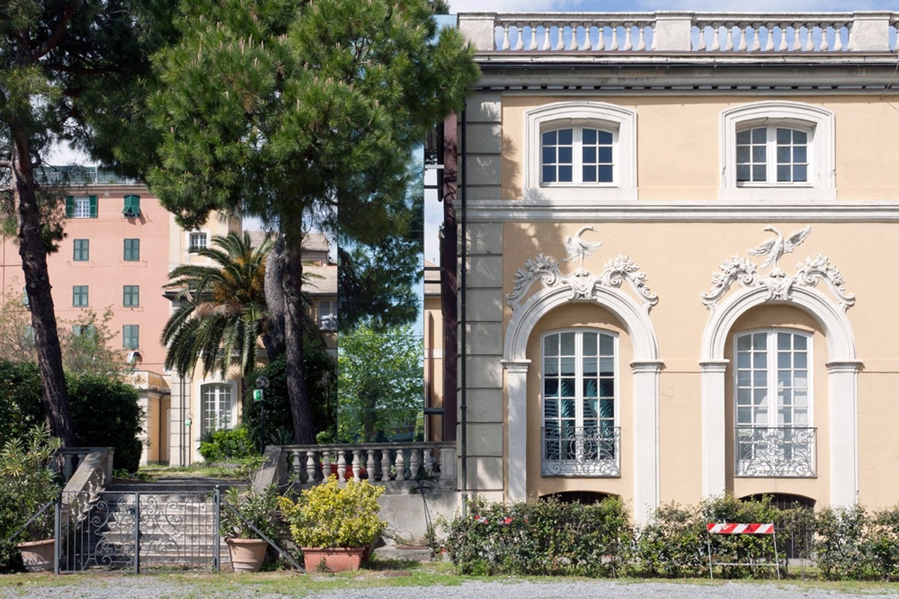 Sp10 ha progettato un ascensore specchiato per eliminare le barriere architettoniche e garantire il libero accesso al primo piano della villa Durazzo Bombrini di Cornigliano, Genova. Il piccolo intervento disegna un volume prismatico tra gli alberi e la facciata, una torre che rispecchia i suoi dintorni.
