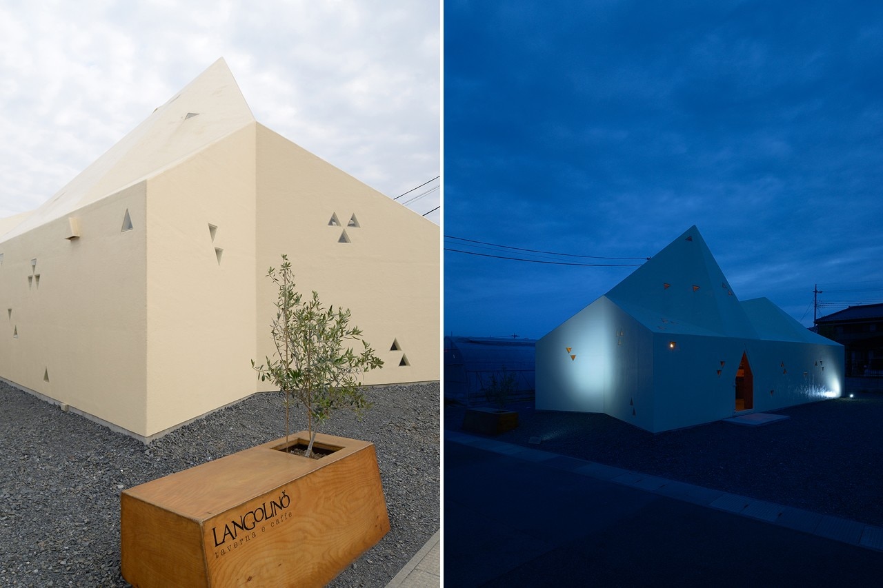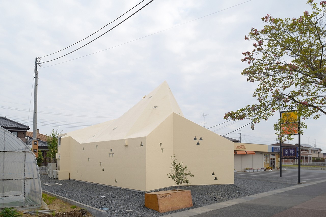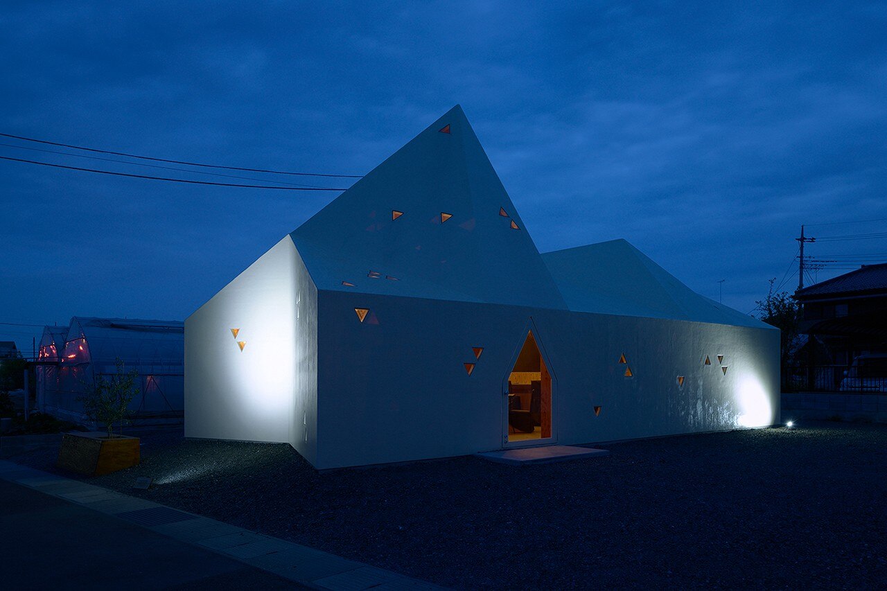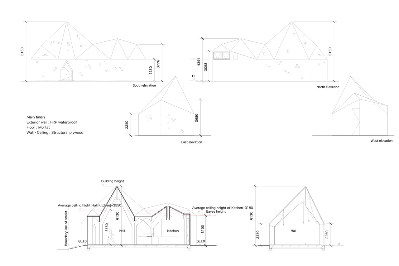L’esterno è rivestito in FRP impermeabile. Le pareti sottili trasmettono all’esterno la luce, i suoni e gli odori dell’ambiente interno. Per evitare una comunicazione diretta tra dentro e fuori le finestre sono state sostituite da piccoli fori triangolari nelle pareti.