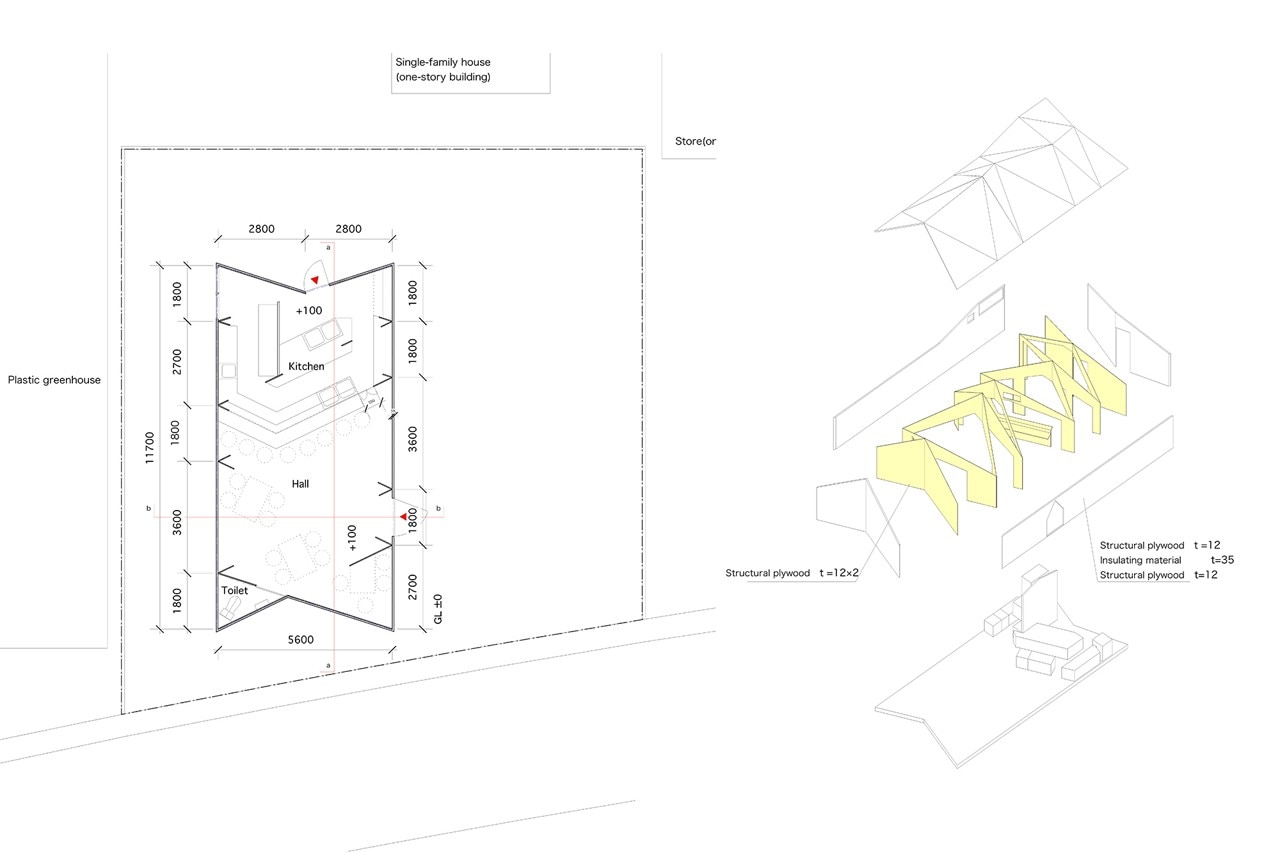 Basandosi sulle idee dell’auto-costruzione e della forma inedita, Geneto ha concepito una struttura semplice in compensato dall’iconica copertura a prismi triangolari. Una struttura monoscocca costituita da un telaio portante in compensato e dalle pareti di tamponamento.