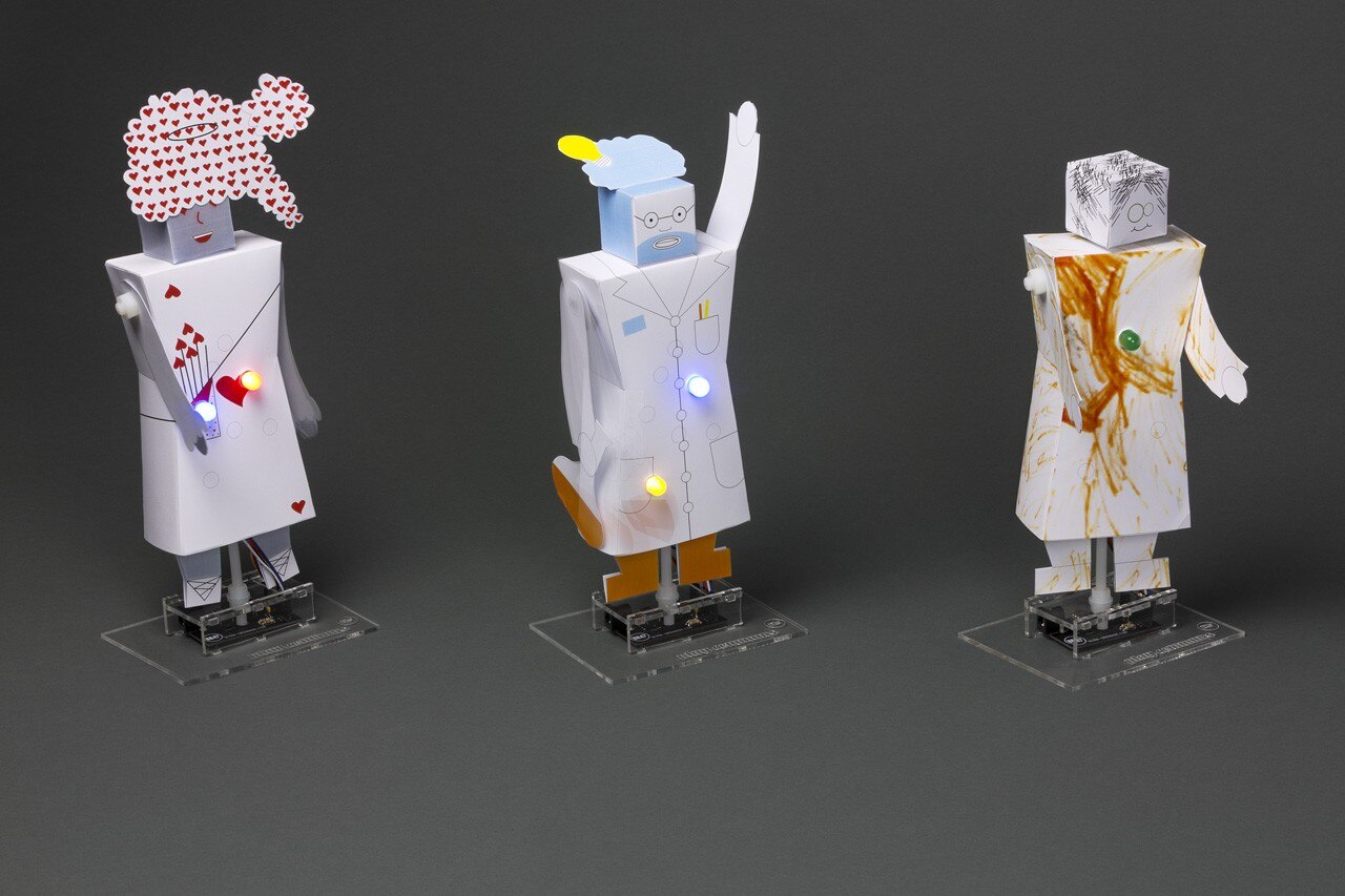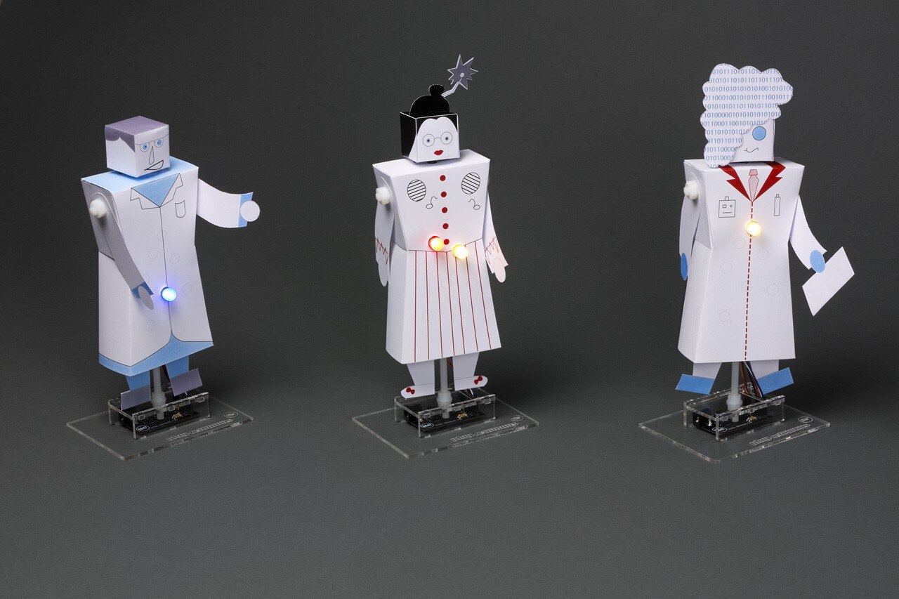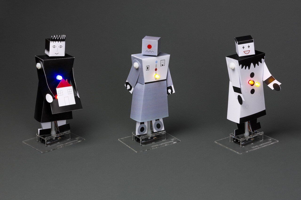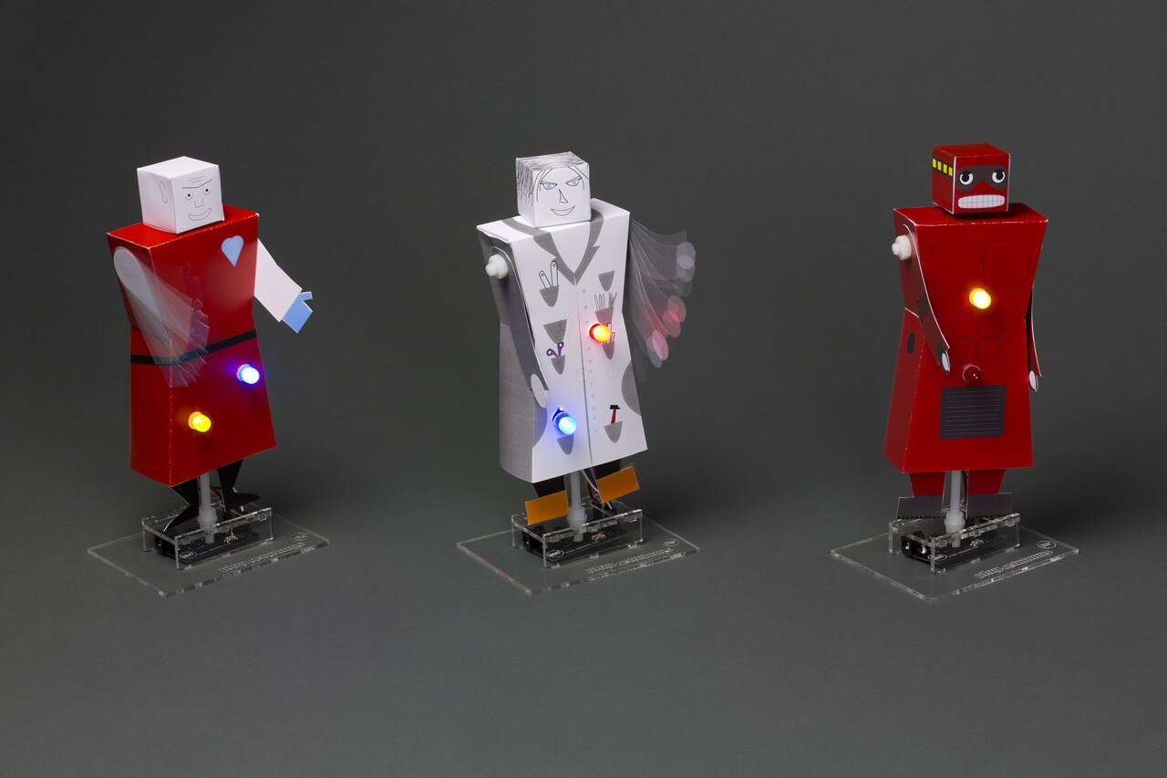 Pochi componenti elettronici – led colorati e servomotori – fanno muovere e girare la testa, il corpo e le braccia dei personaggi, ognuno in grado di esprimere una diversa personalità e soluzioni fuori dagli schemi. A stimolare la fantasia e la creatività, le figure dei robot sono pensate per essere modificate, migliorate e inventate dai bambini.