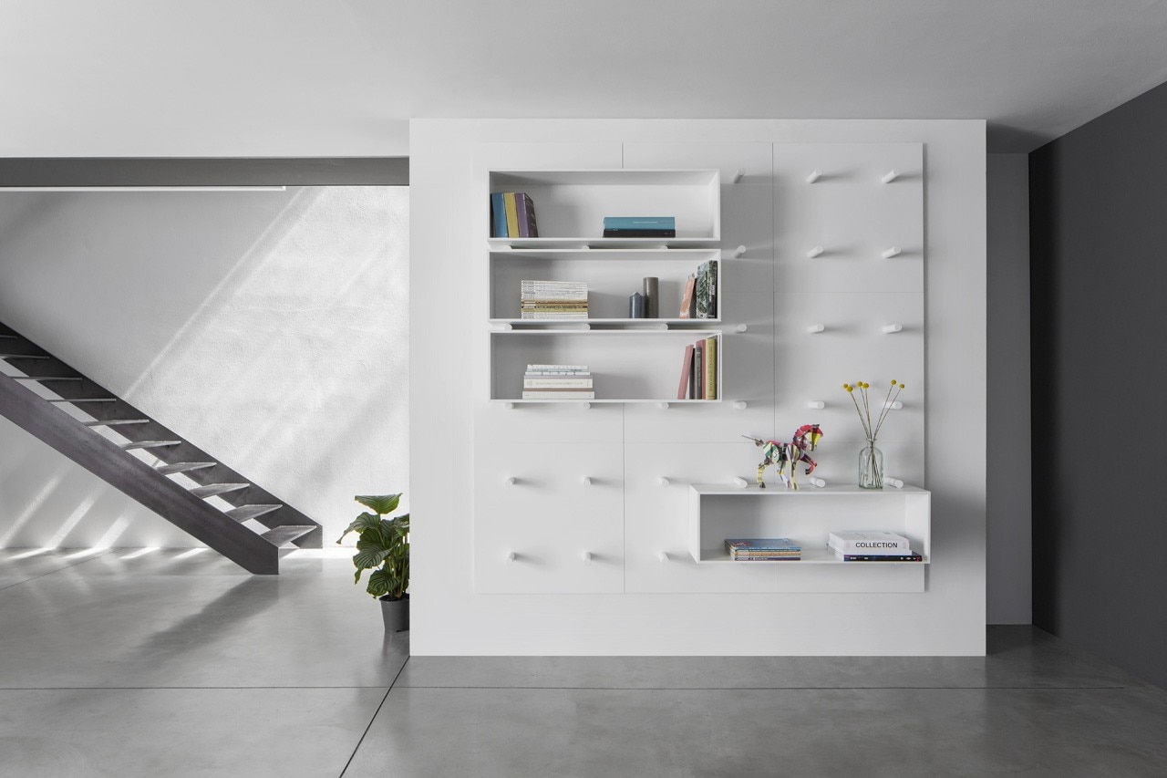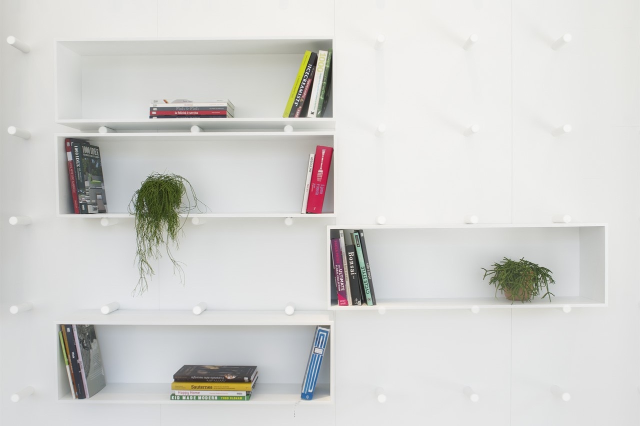La libreria Dots, progettata dallo studio Aris Architects, prodotta da Polarislife, scardina il concetto tradizionale di sistema composto da fianco e mensola a favore di un sistema puntiforme, modulare formato da pannelli di 70 x 70 cm che vengono fissati alla parete.