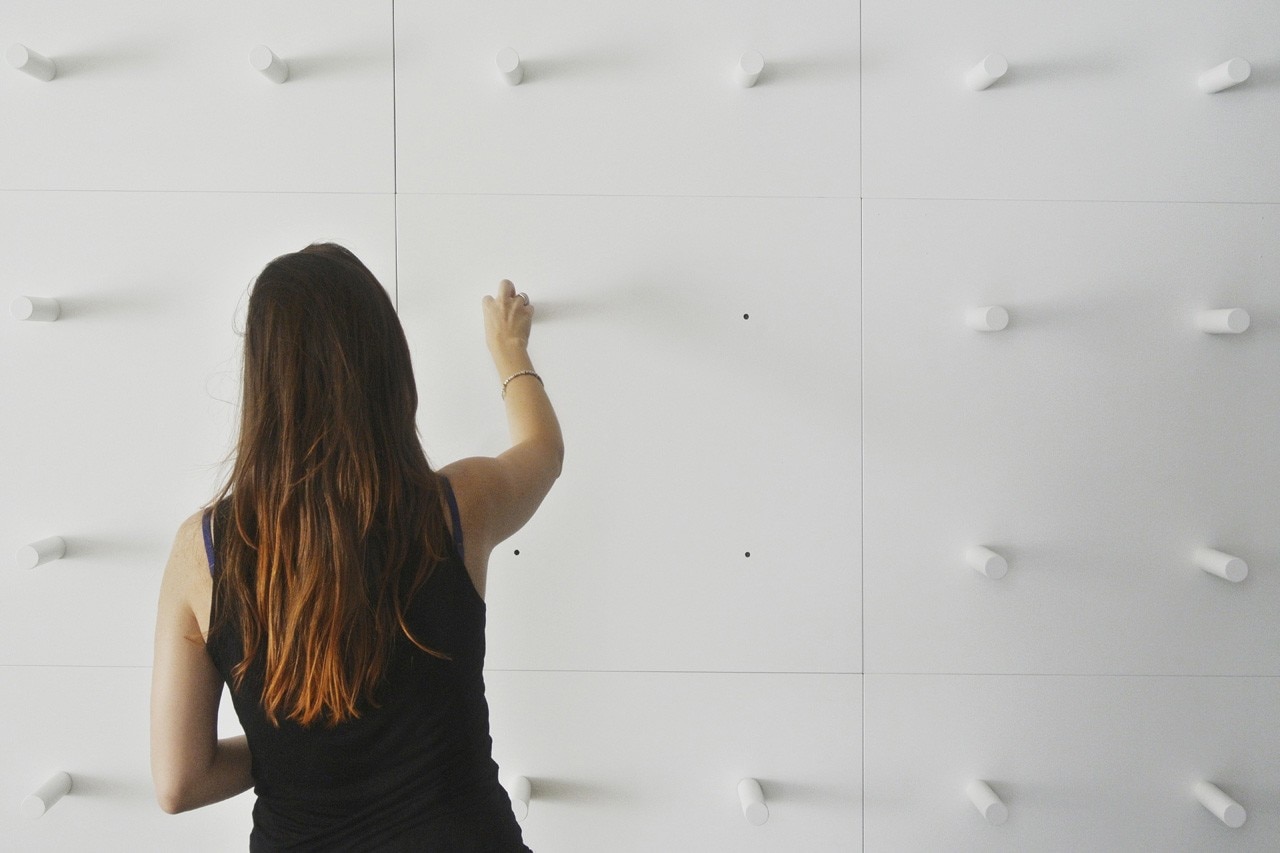 A questi pannelli vengono poi avvitati dei piccoli cilindri che sono al tempo stesso pattern puntiforme regolare e sostegno per il box, che a piacimento vengono inseriti, aggiunti, tolti o spostati.