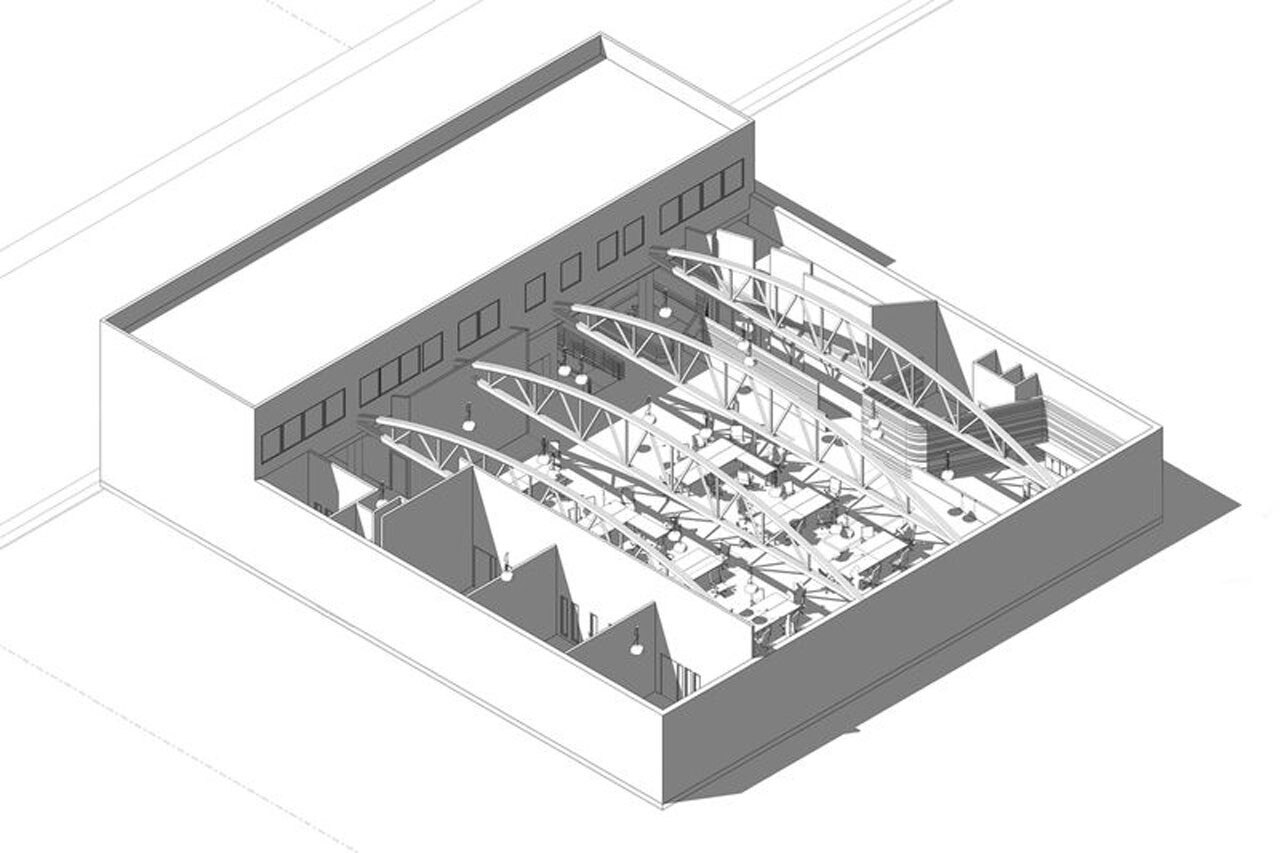 La parete compensato funge da elemento-guida di tutto lo spazio. I limitati aggiornamenti strutturali e meccanici sono stati lasciati a vista e minimali. Un muro di compensato avvolge tutto, guidando il visitatore attraverso lo spazio e svolgendo funzioni diverse nei vari ambienti.