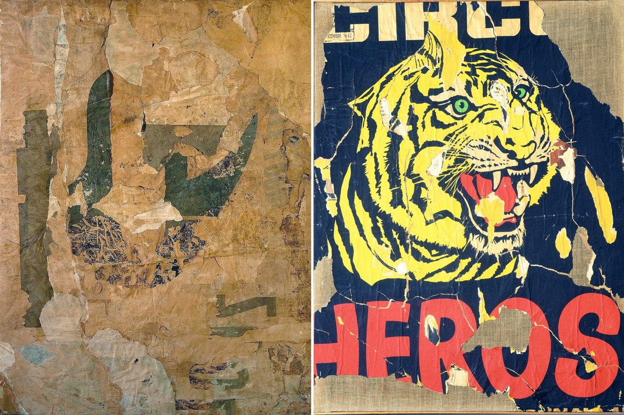 A sinistra: Mimmo Rotella, Not in Venice, 1959, retro d'affiche su tela, cm 95x72, MART - Museo d'arte moderna e contemporanea di Trento e Rovereto, Rovereto. A destra: Mimmo Rotella, La tigre, 1962, Décollage su tela, 108 x 84 cm, Collezione privata / Private collection