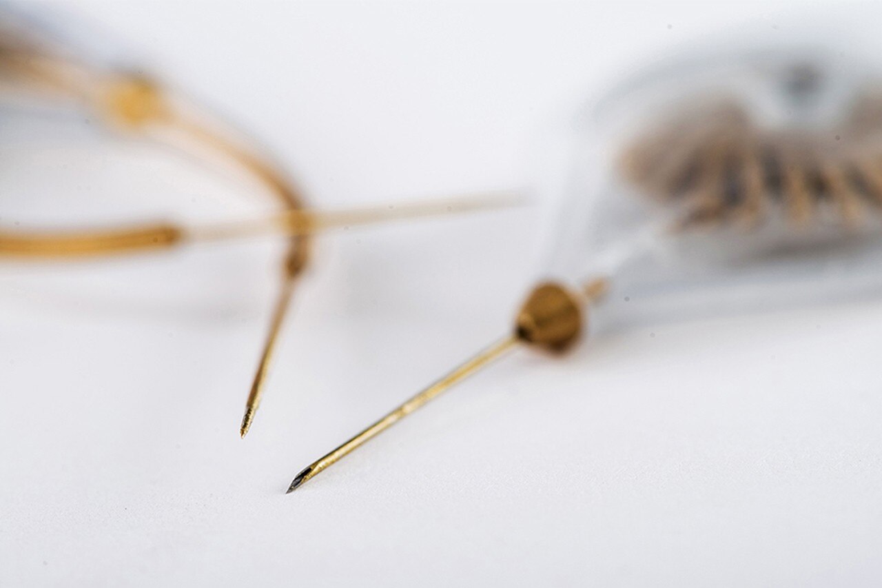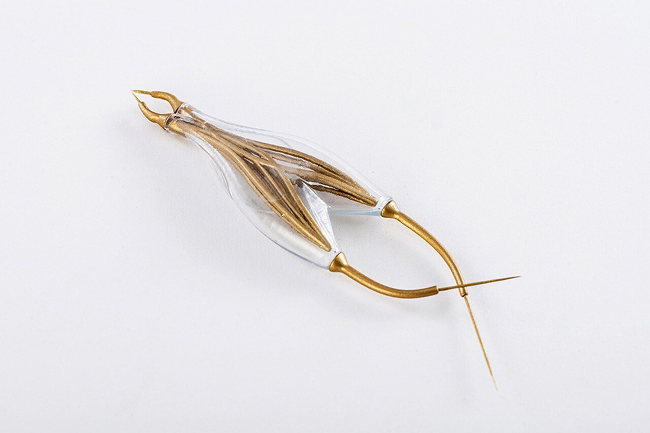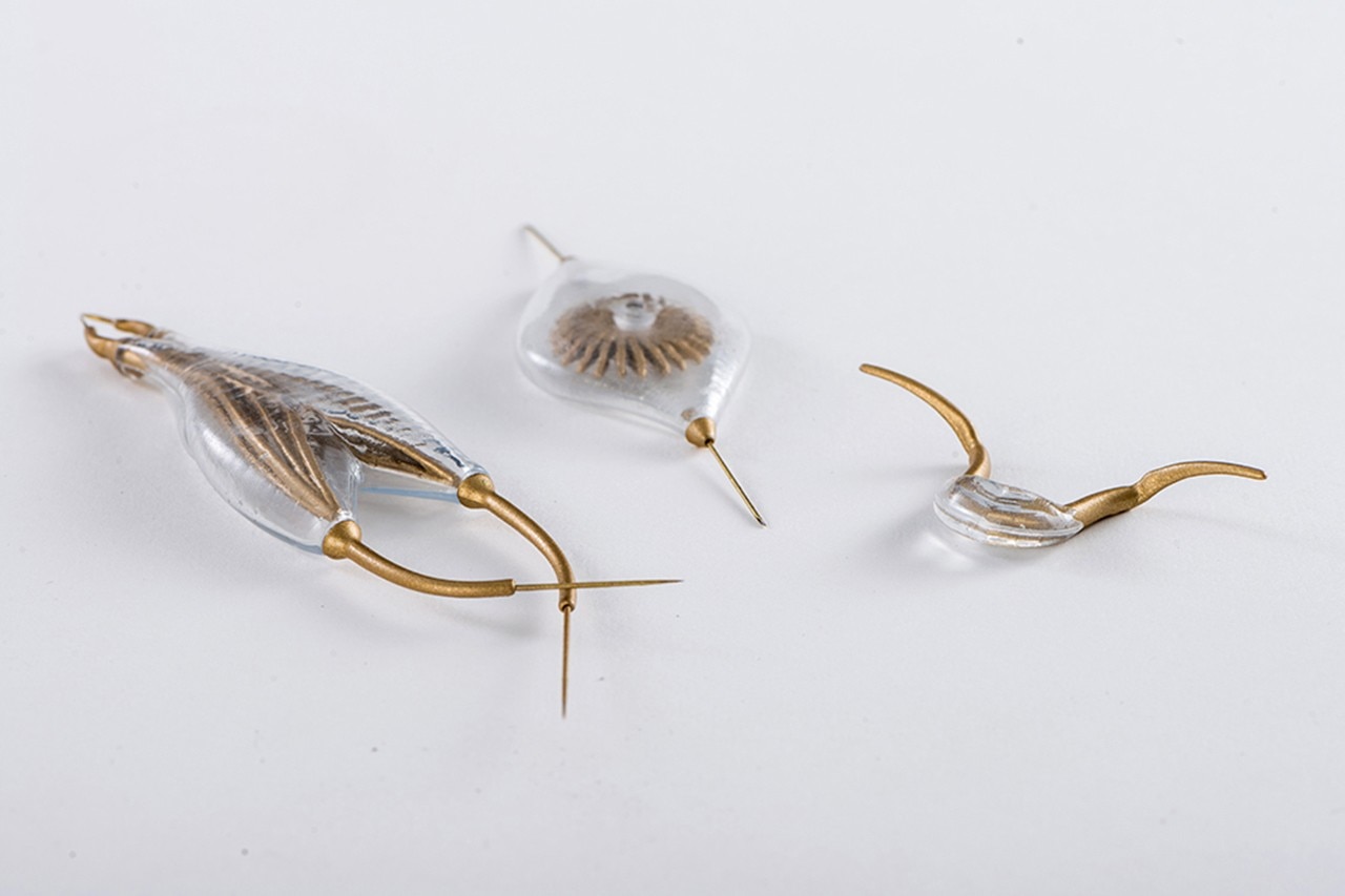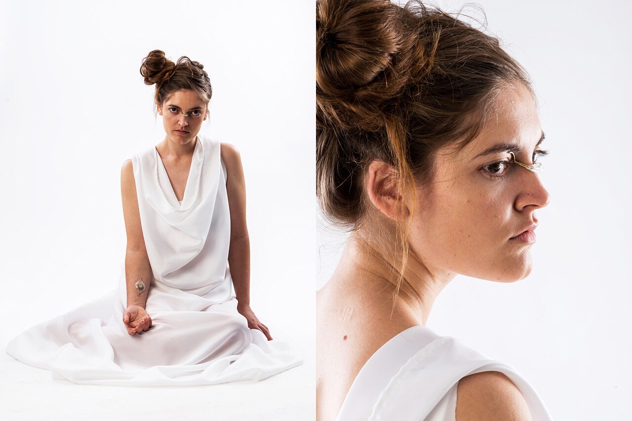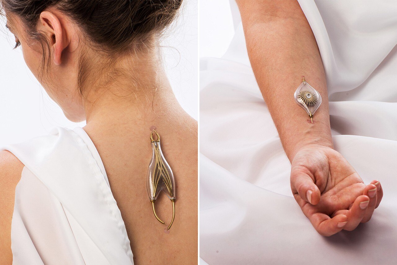 Nell’estetica del progetto la designer ha voluto ottenere un aspetto organico-meccanico, simbolo della contraddizione tra i due elementi, il corpo contro la macchina. Gli accessori sono costituiti da un guscio realizzato con un biopolimerochiaro, mentre il “cuore” e gli aghi sono in oro. I prototipi sono stati tutti stampati in 3D.