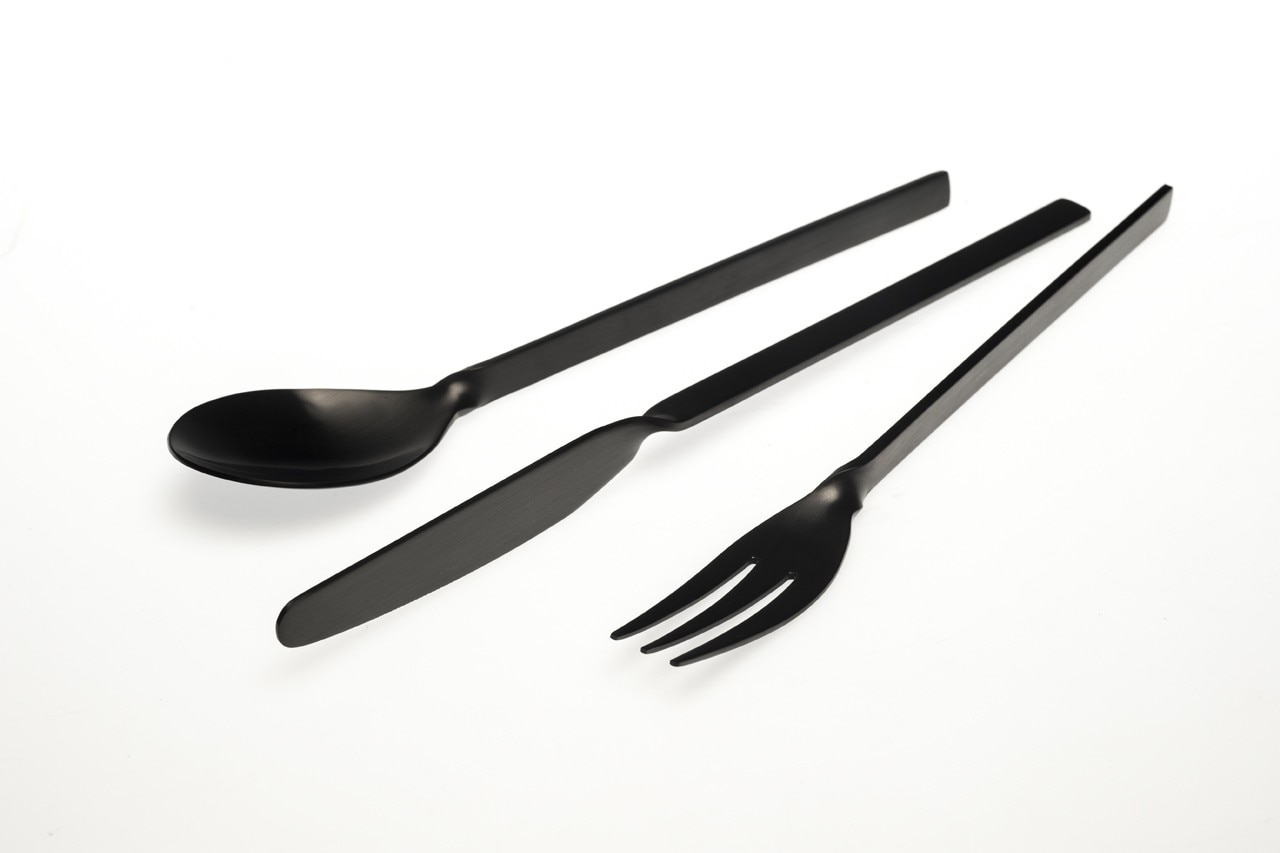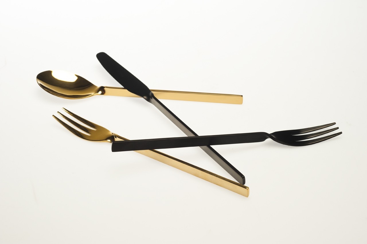 Il set, realizzato in acciaio inox 18/10, si distingue per le sue linee fluide e sofisticate al tempo stesso, senza tuttavia sacrificare ergonomia o funzionalità. La collezione ha un carattere spigoloso e moderno, che si adatta facilmente sia ad ambienti formali che informali.