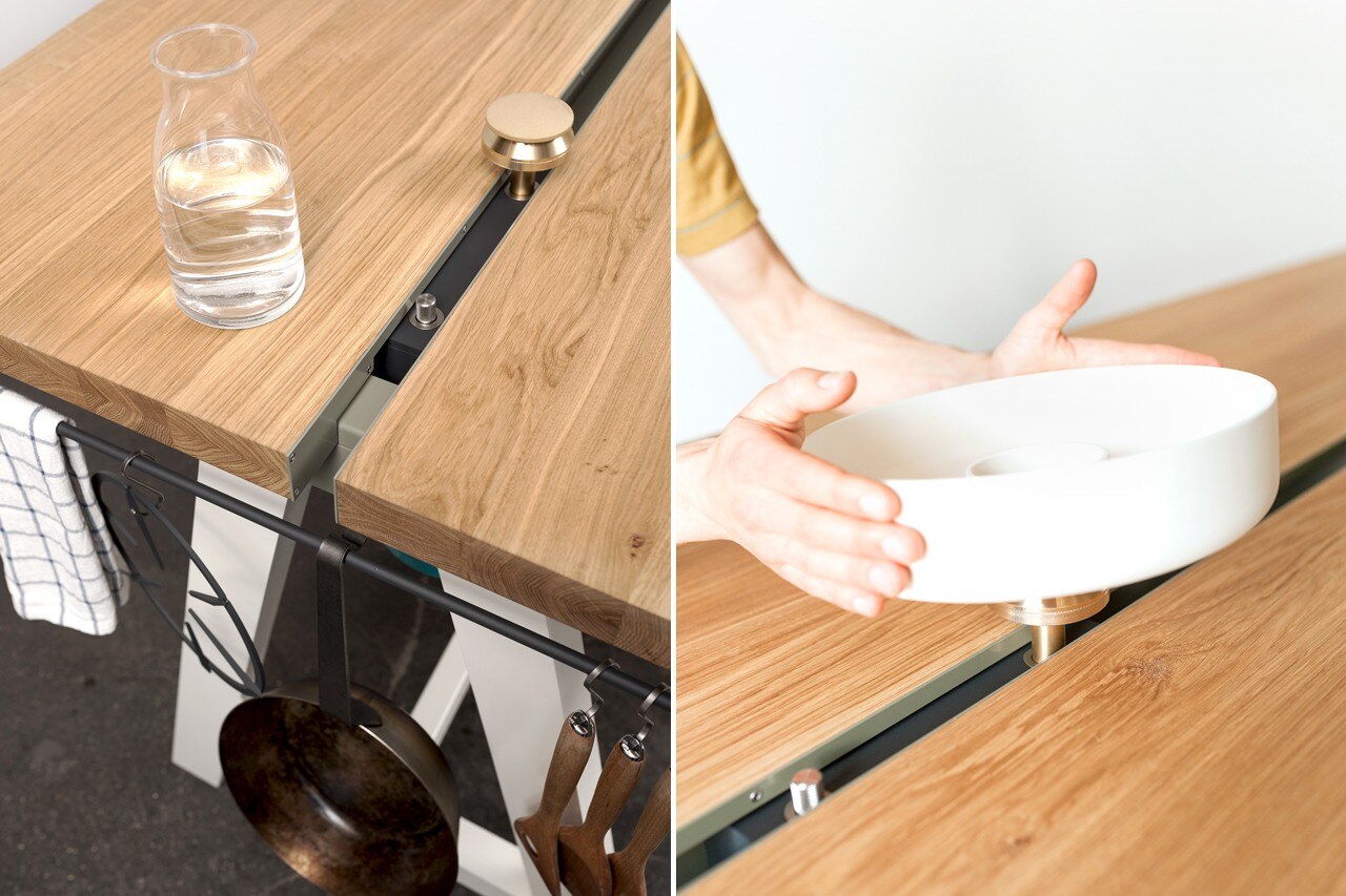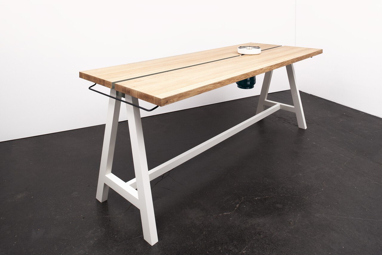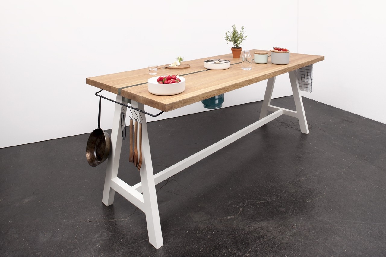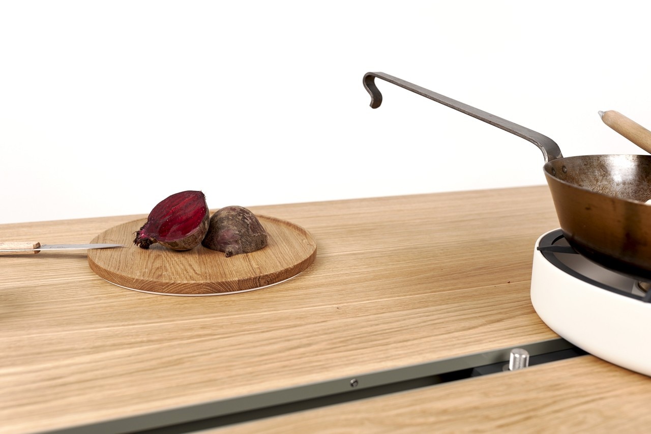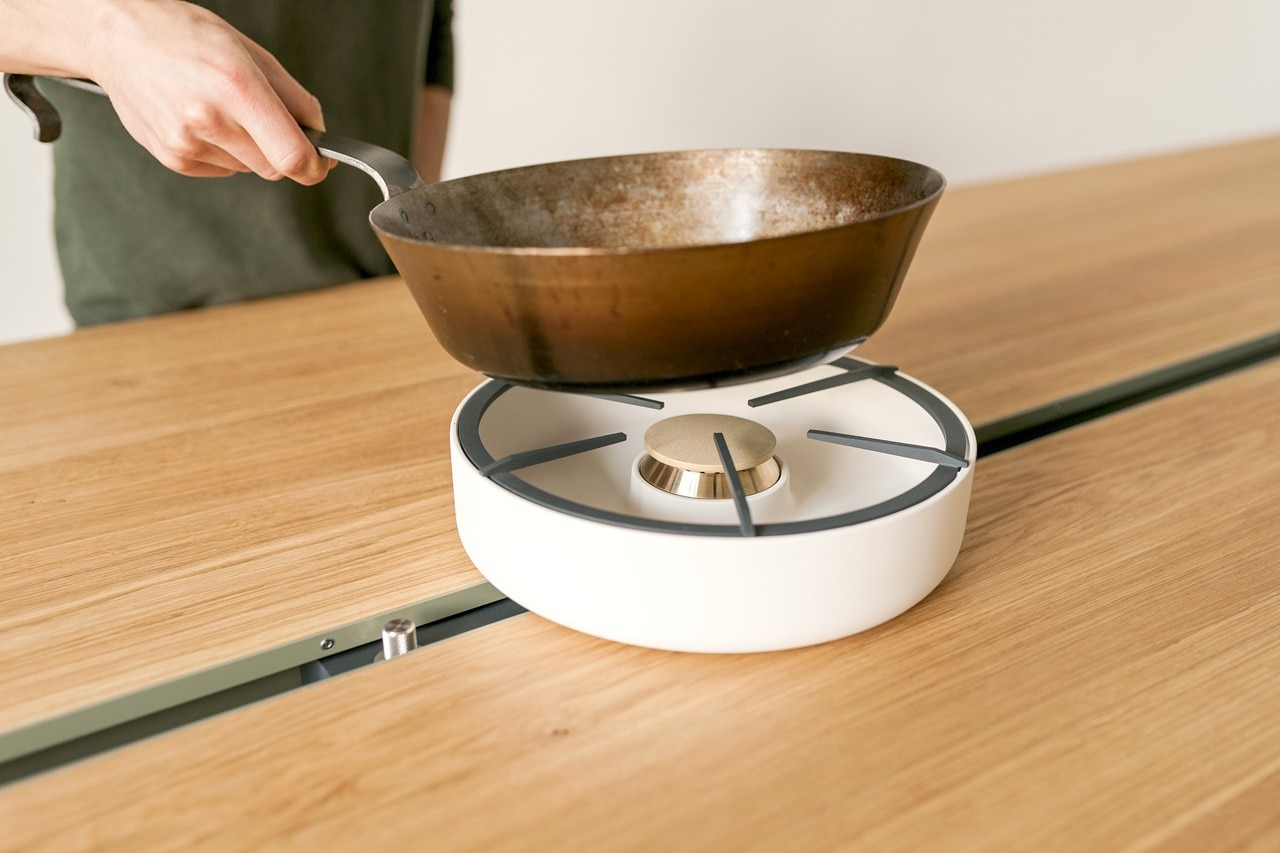 I fornelli, costituiti da bruciatori a gas mobili, completano la famiglia di prodotti e l’idea di cucina sviluppata da questo progetto. Allontanando i due piani del tavolo si crea lo spazio per inserire i bruciatori all’interno di piccoli moduli che scorrono lungo un binario nascosto. Tali moduli possono essere spostati facilmente da un lato del tavolo all’altro. Così la stufa si trasforma in uno strumento di cottura flessibile che può essere adattato alle esigenze individuali in termini di posizione di cottura e di numero di fuochi. La base di ceramica che circonda il bruciatore a gas durante la cottura serve per l’isolamento termico.