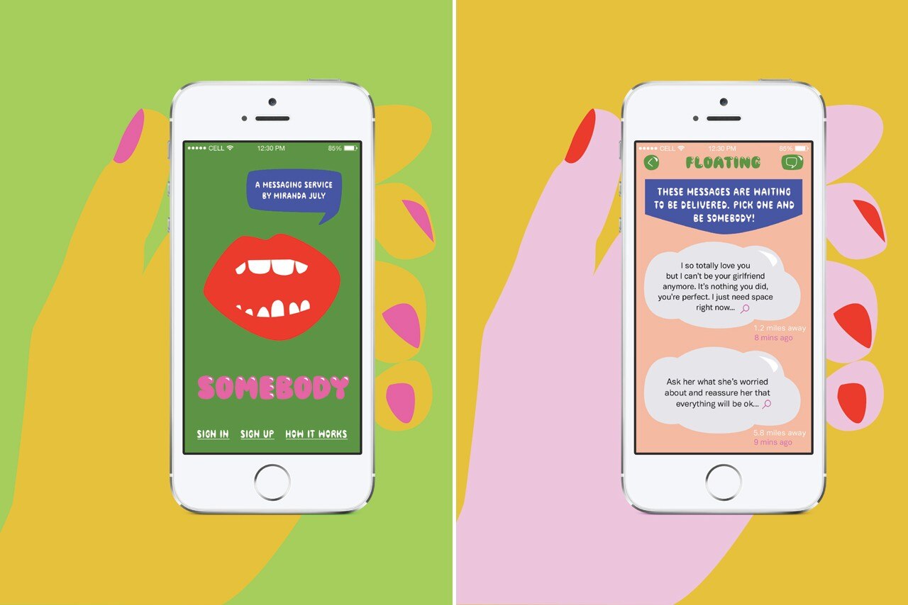 Dal momento che Somebody è appena stata sviluppata, i primi utenti sono parte integrante di sua creazione: la parte più high-tech dell’app non è nel telefono ma negli utenti che hanno il coraggio di consegnare un messaggio a uno sconosciuto. “Vedo questo progetto come un lungimirante intervento di arte pubblica, che stimola la conversazione e gioca con il rischio”, afferma Miranda July.