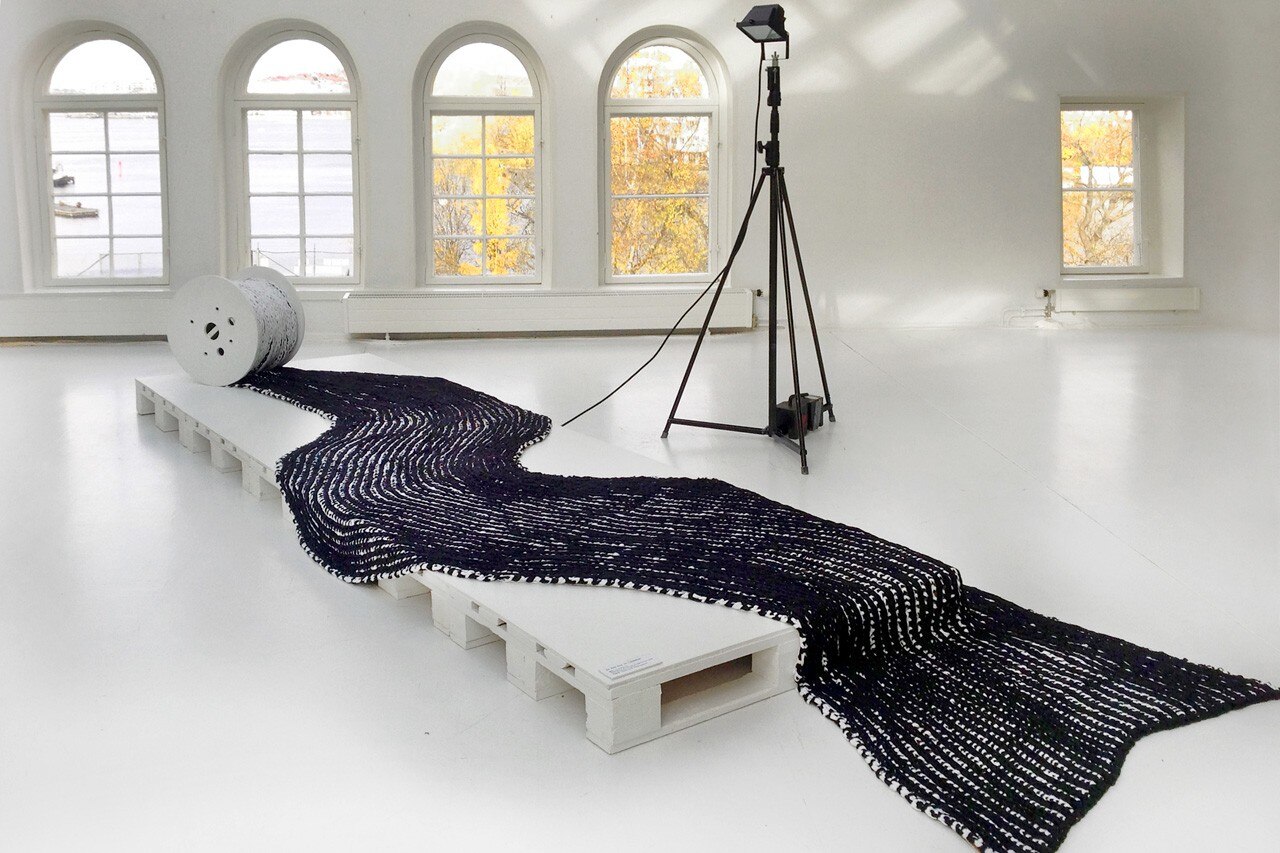 Squeeze Me, Hold Me è realizzato con il punto brioche bicolore, una tecnica molto elastica che si realizza facilmente e prende forme diverse a seconda del peso del filato. Il telo è utilizzabile su due lati, uno a dominate di colore nero, l’altro bianco.