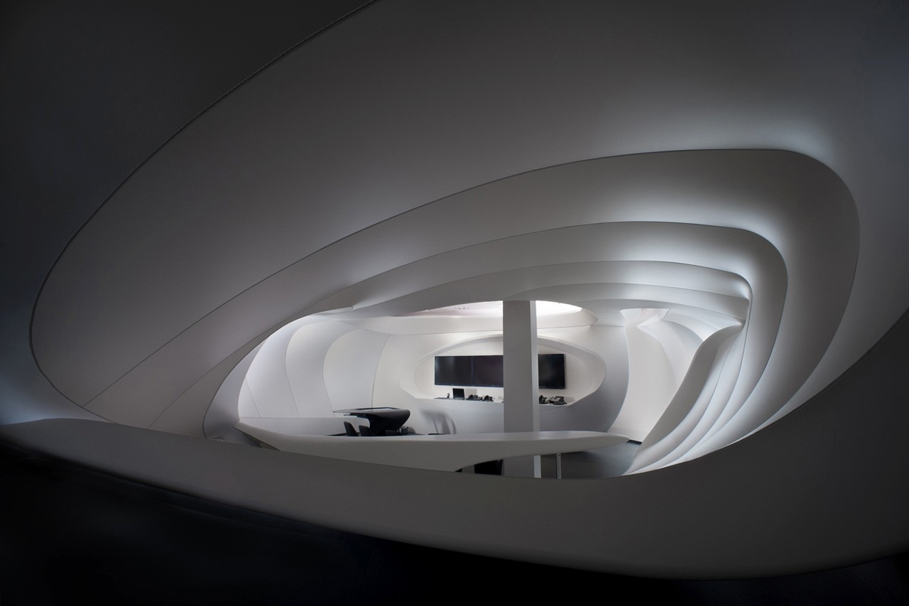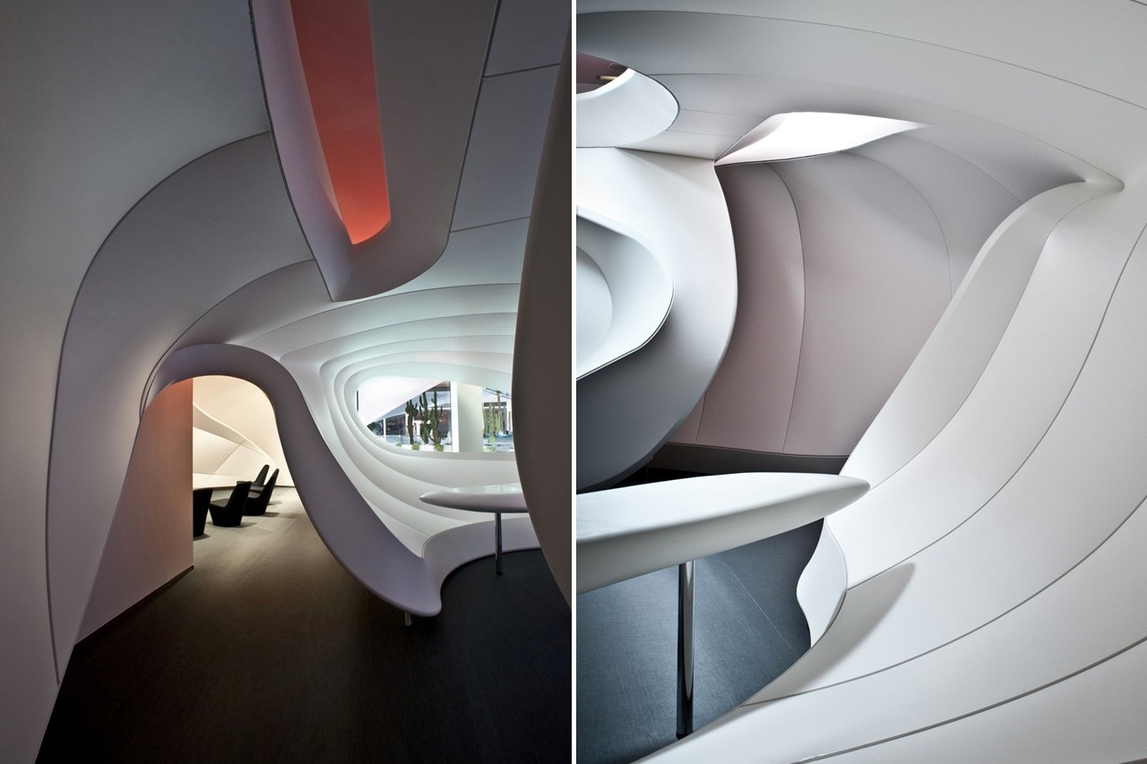 Lo spazio fornisce in primo luogo una zona relax da cui il cliente è intuitivamente attirato a oltrepassare i “muri organici” che conducono alla zona di accoglienza. La zona principale del negozio è collocata al centro, dove l’installazione “OneNet” conduce alla sezione posteriore tramite uno stretto corridoio e determina la lenta transizione tra il mondo reale e la dimensione digitale. Da qui si accede ad altri due spazi, di forma diversa, dove il tour si conclude.