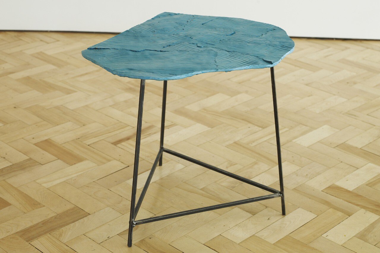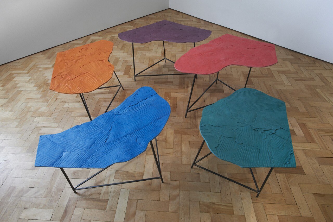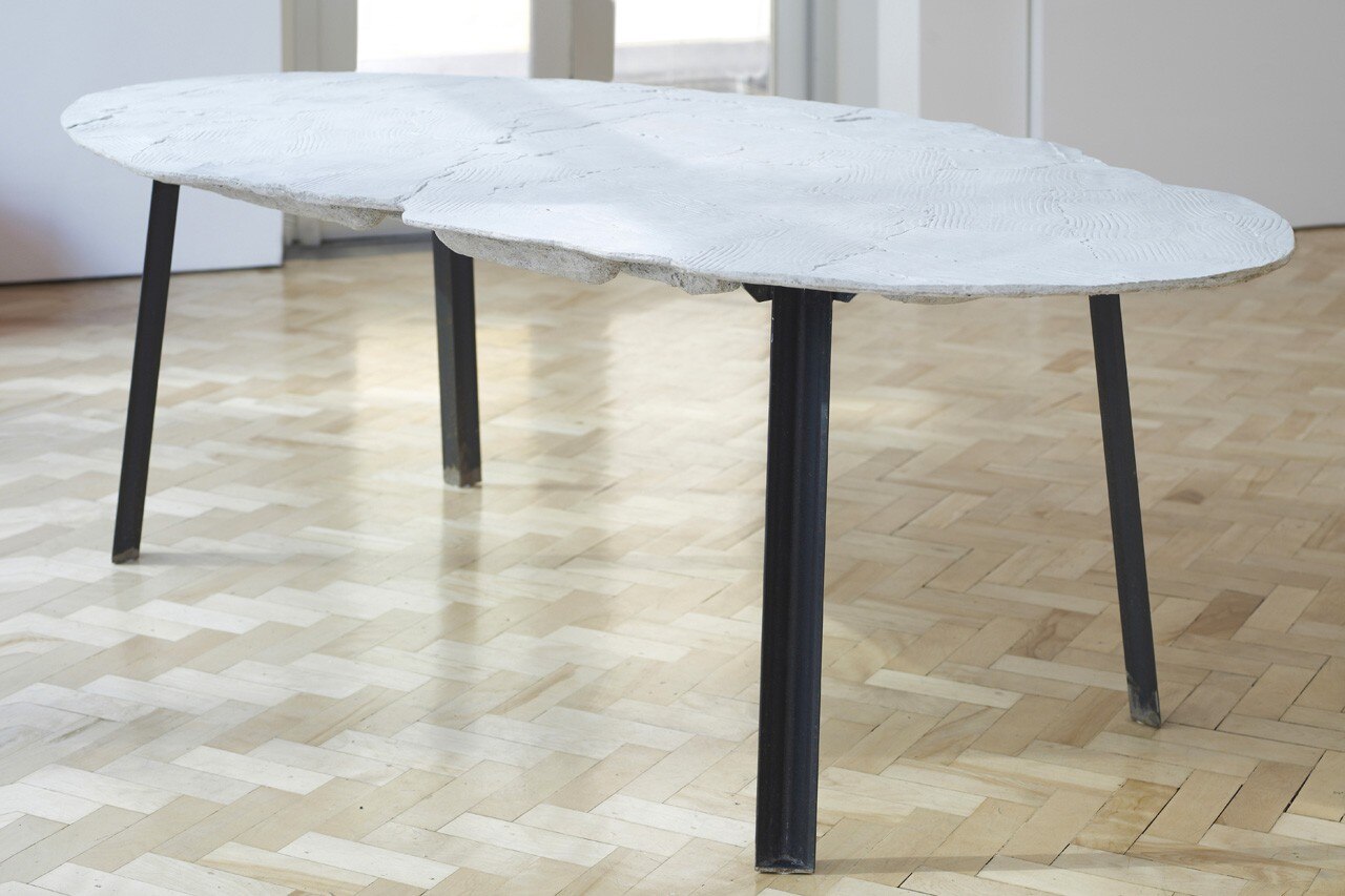 Marigold ha applicato lo stesso processo – costruzione di una forma a partire da singoli moduli di cera impressionati – al fine di creare uno stampo più grande per i tavoli di legno. Una volta che lo stampo generale è stato completato sono stati realizzati i tavoli. Cambiando i materiali utilizzati o le singole forme di ogni pezzo mentre il materiale liquefatto (principalmente Jesmonite) era sullo stampo, la collezione ha assunto un dinamismo che appare in contraddizione con l’unicità dello stampo.