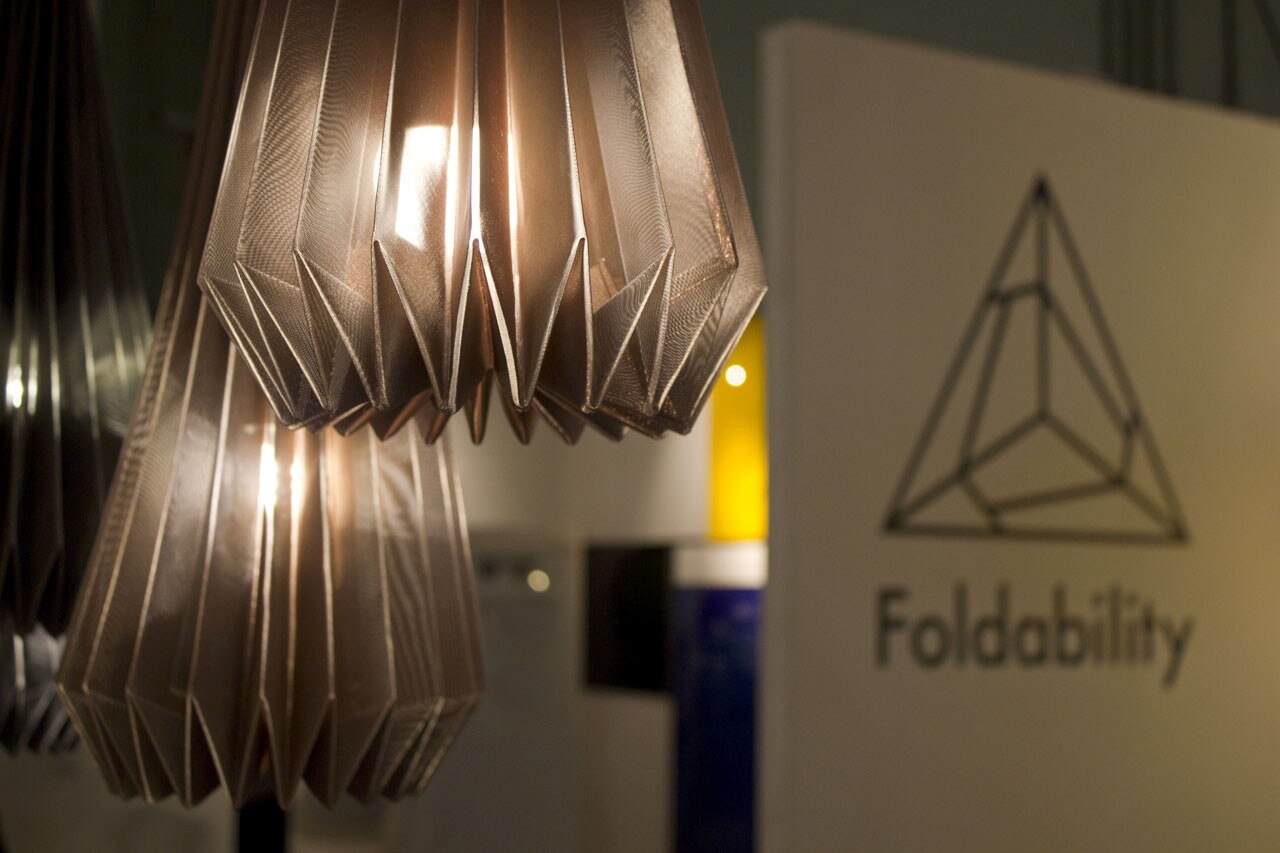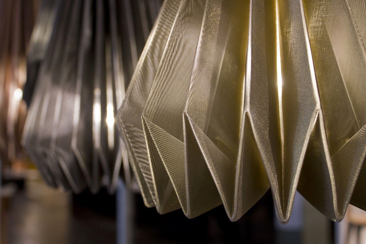 Kyla McCallum ha presentato a Design Junction Equi Collection, un lampadario e una collezione di tessuti metallizati realizzati con piegature che donano loro forme avveniristiche.