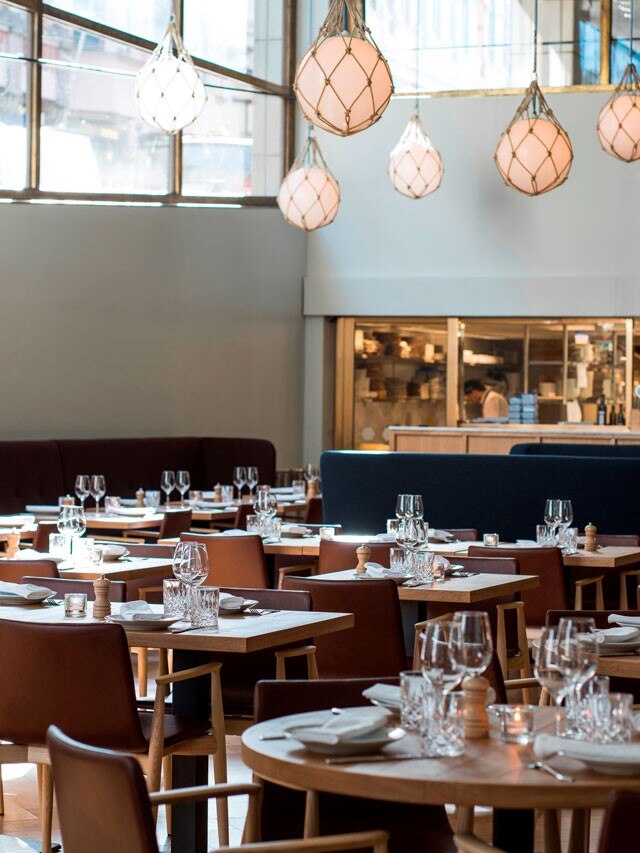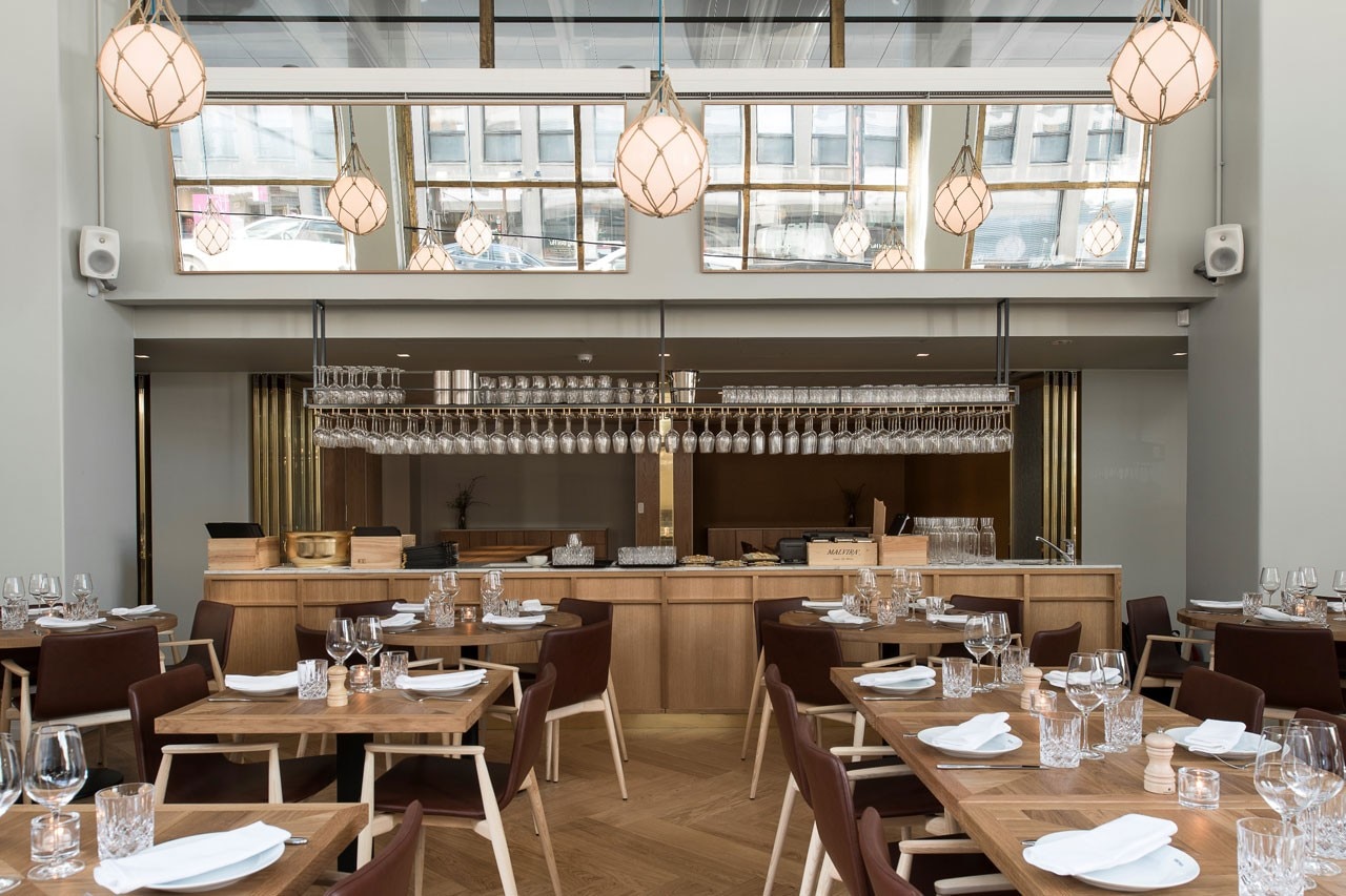 L’area del cocktail bar accoglie i clienti con colori e materiali caldi come l’ottone, il legno, il marmo e la pelle, il tutto esaltato da un pavimento piastrellato che richiama le onde del mare scandinavo. Una grande parete di vetro che contiene e mostra i vini separa l’area cocktail dalla luminosa sala da pranzo inondata di luce naturale grazie alle grandi vetrate che la rendono un tutt’uno con la strada.
