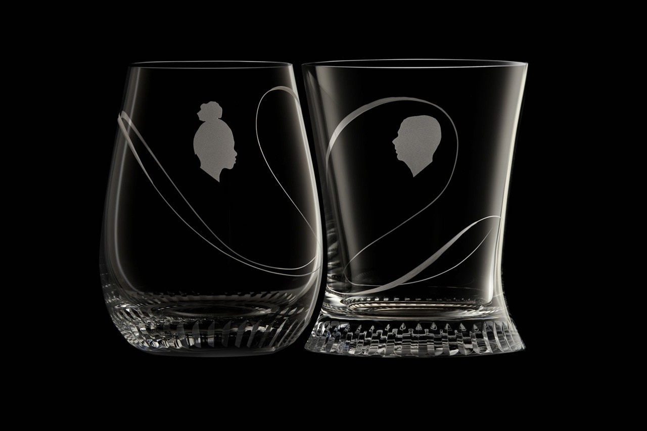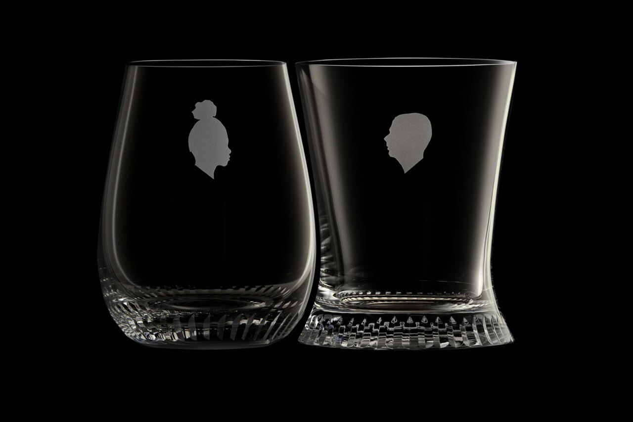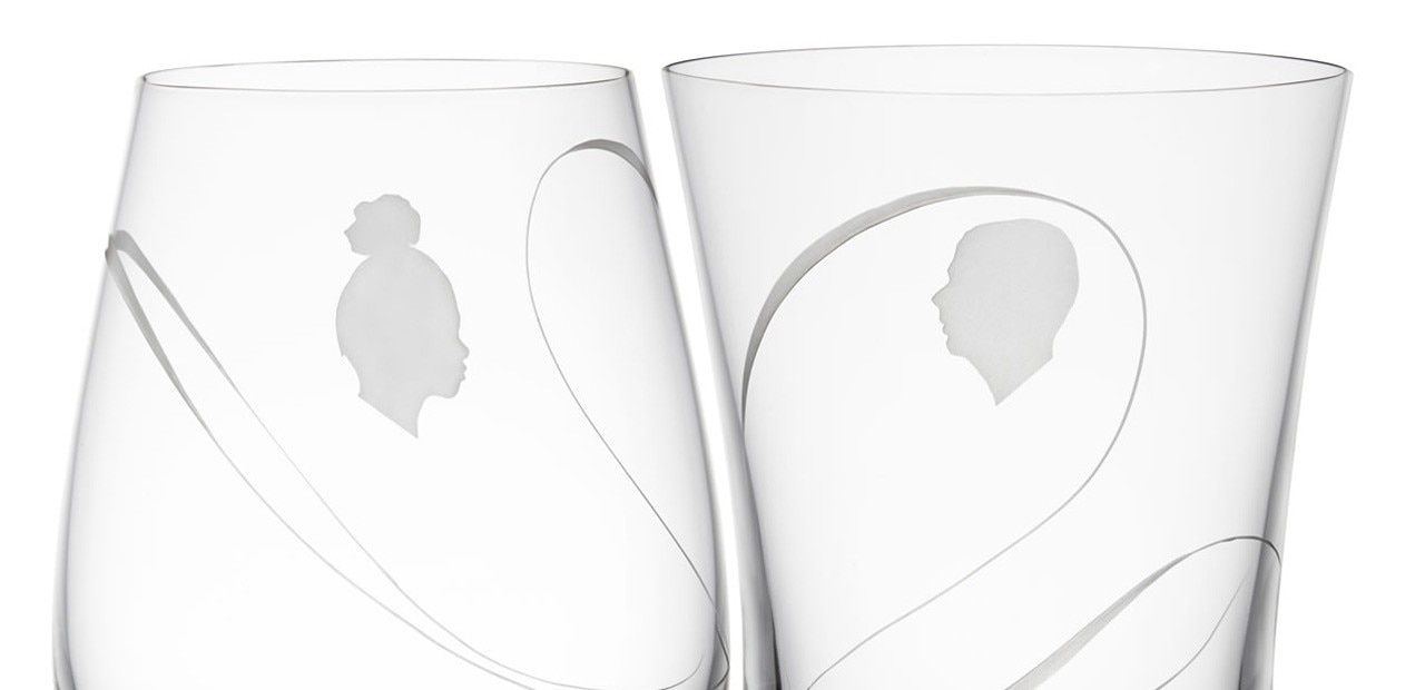 I bicchieri sono disponibili in tre varianti – un set semplice, con solo la base inatgliata, uno personalizzato con due sagome, e un terzo set con l’aggiunta di un motivo inciso nastriforme, che sembra scorrere tra i due bicchieri, collegandoli.
