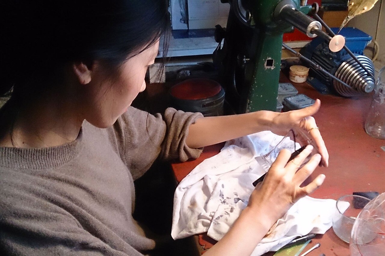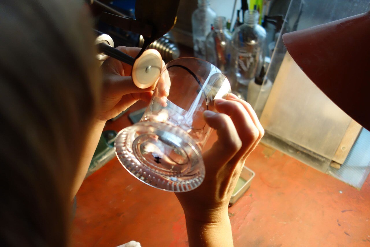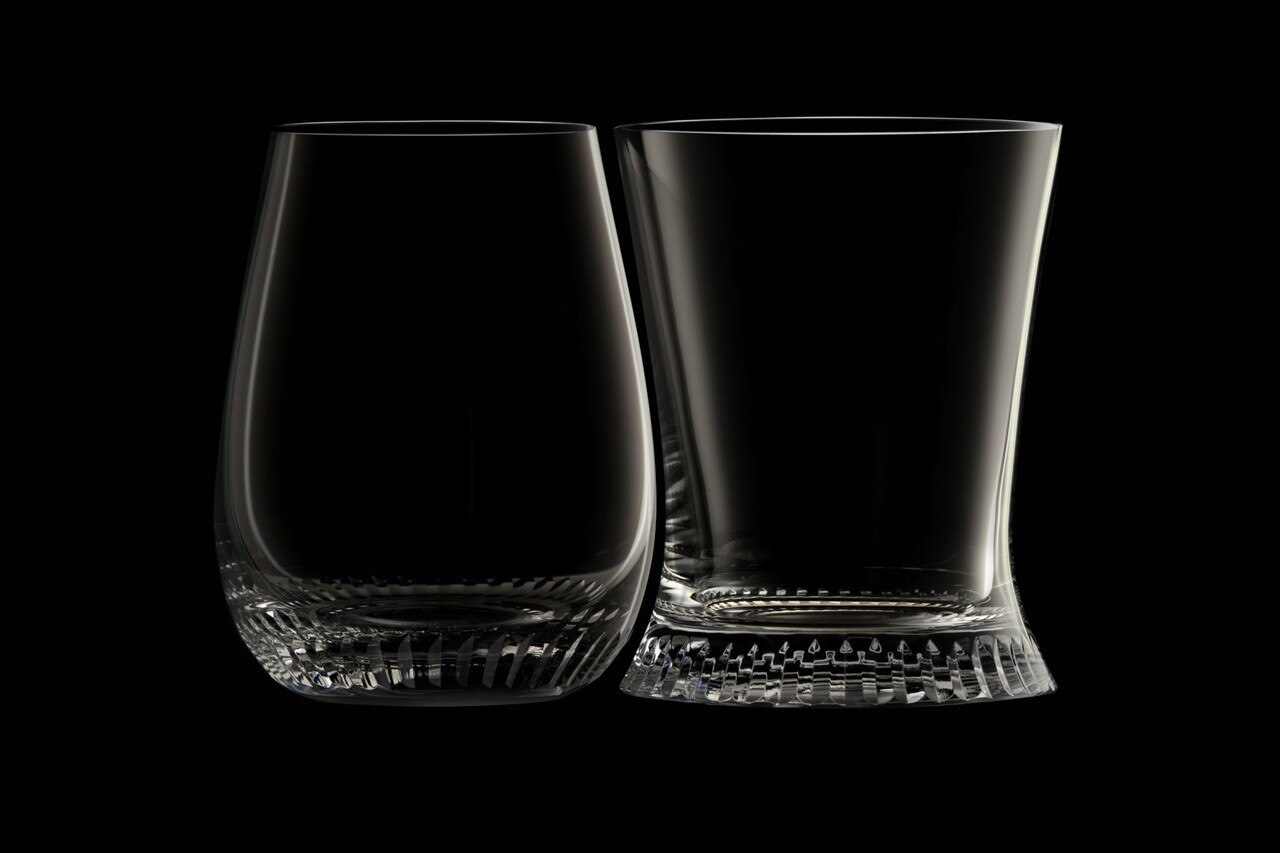 I bicchieri sono disponibili in tre varianti – un set semplice, con solo la base inatgliata, uno personalizzato con due sagome, e un terzo set con l’aggiunta di un motivo inciso nastriforme, che sembra scorrere tra i due bicchieri, collegandoli.