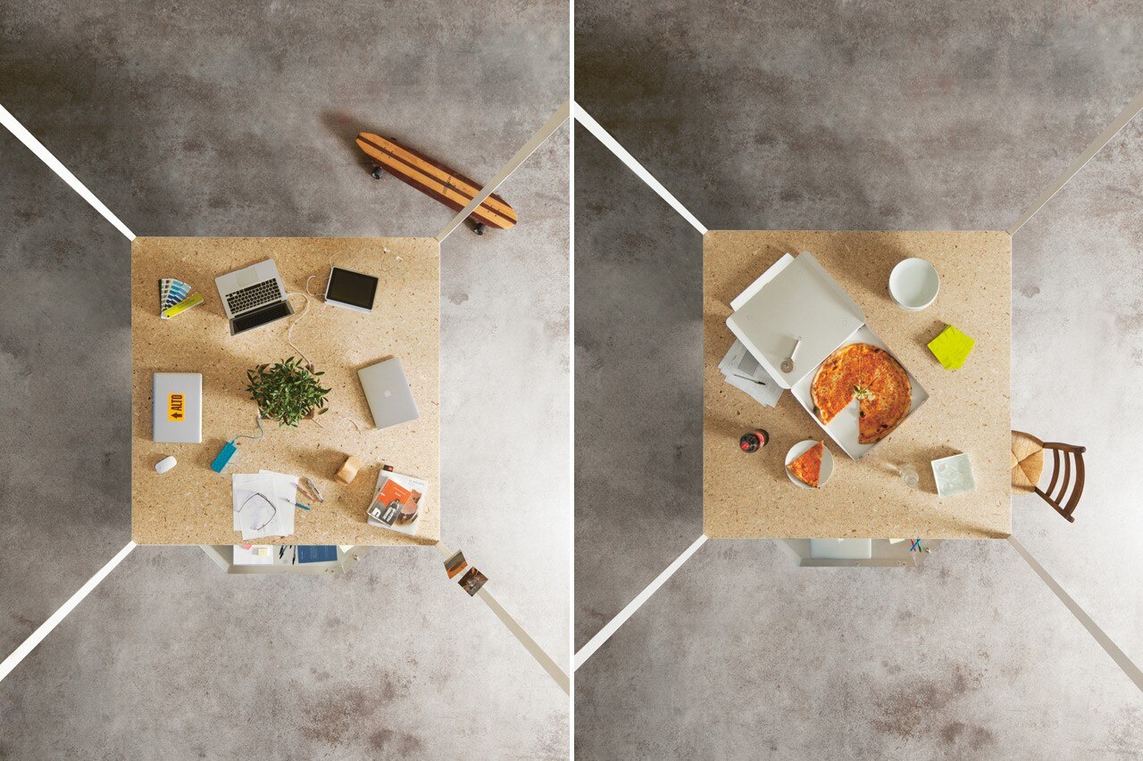 Hub si apre alla possibilità di personalizzare lo spazio delle proprie attività grazie a un sistema modulare configurabile come postazione indipendente o composizioni multiple. Dal punto di vista dei materiali è disponibile con finiture naturali tortora, grigio o ISB in scaglia di legno per il piano contrapposte a tessuti gialli, blu o arancioni.
