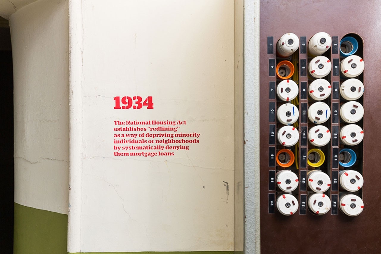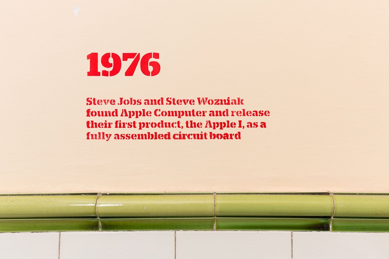 Vista della mostra "SQM: The Quantified Home", installata alla Broel School. Concepita dal curatore Joseph Grima e da Space Caviar, collettivo con base a Genova, la mostra combina stralci di libri, citazioni di canzoni, tweet con aforismi originali presi dai principali autori contemporanei, commissionati per la Biennale Interieur 2014. Photo © Delfino Sisto Legnani