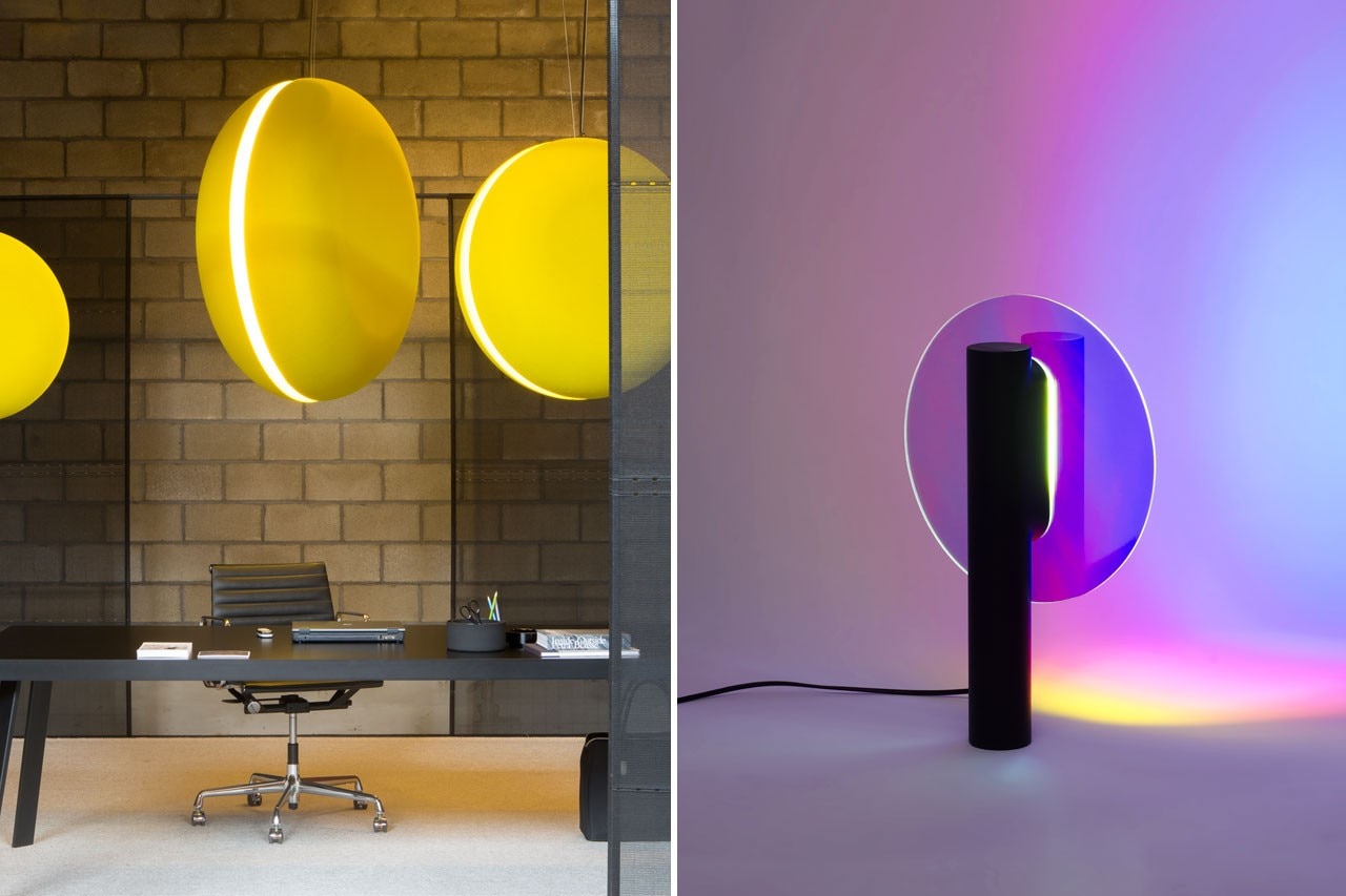 A sinistra: la collezione acoshape+, oggetti fonoassorbenti con integrata una fonte luminosa, è stata presentata dall'azienda belga Acoshape+. A destra: dopo essere stata presentata in anteprima lo scorso aprile allo Spazio Rossana Orlandi, torna a Biennale Interieur 2014, nello stand del brand francese Moustache, la lampada da tavolo Aurore disegnata da Ferréol Babin