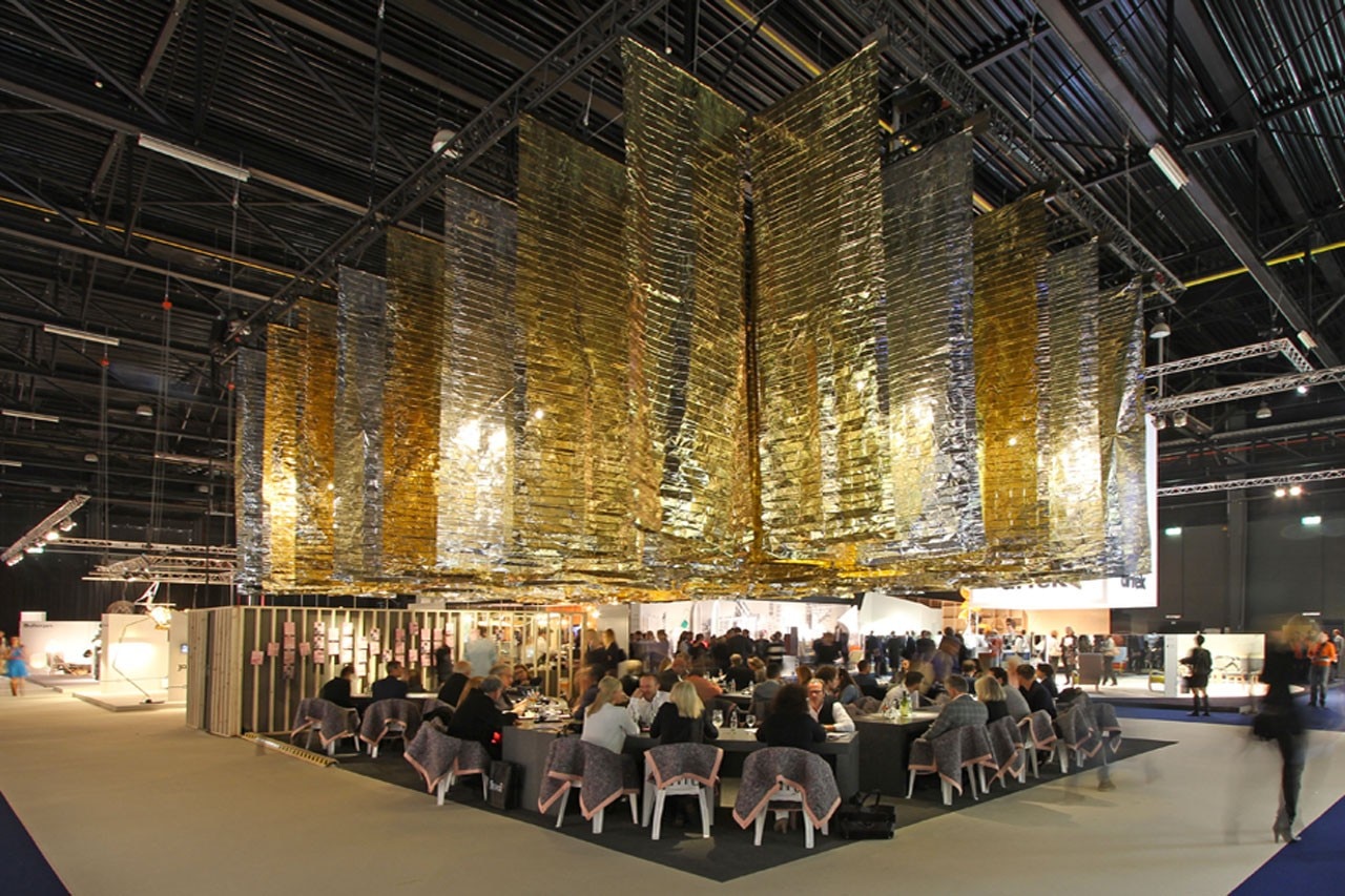 Al centro della Hall 4 è stato allestito il progetto “Dried Chat Room”, uno dei cinque spazi bar della Biennale Interieur 2014, vincitori degli Interieur Awards nella categoria Spaces indetti dalla stessa Biennale. Frutto della partnership tra lo studio milanese DWA (Alberto Artesani e Frederik De Wachter) e lo studio bergamasco Spectacularch! (Francesca Perani e Sandra Marchesi), lo spazio utilizza materiali inconsueti e di basso costo: un cielo dorato composto da drappi riflettenti, tavoli in polistirolo grigio, sedie in plastica da giardino impreziosite da panni di feltro riciclato. Photo © Francesca Perani