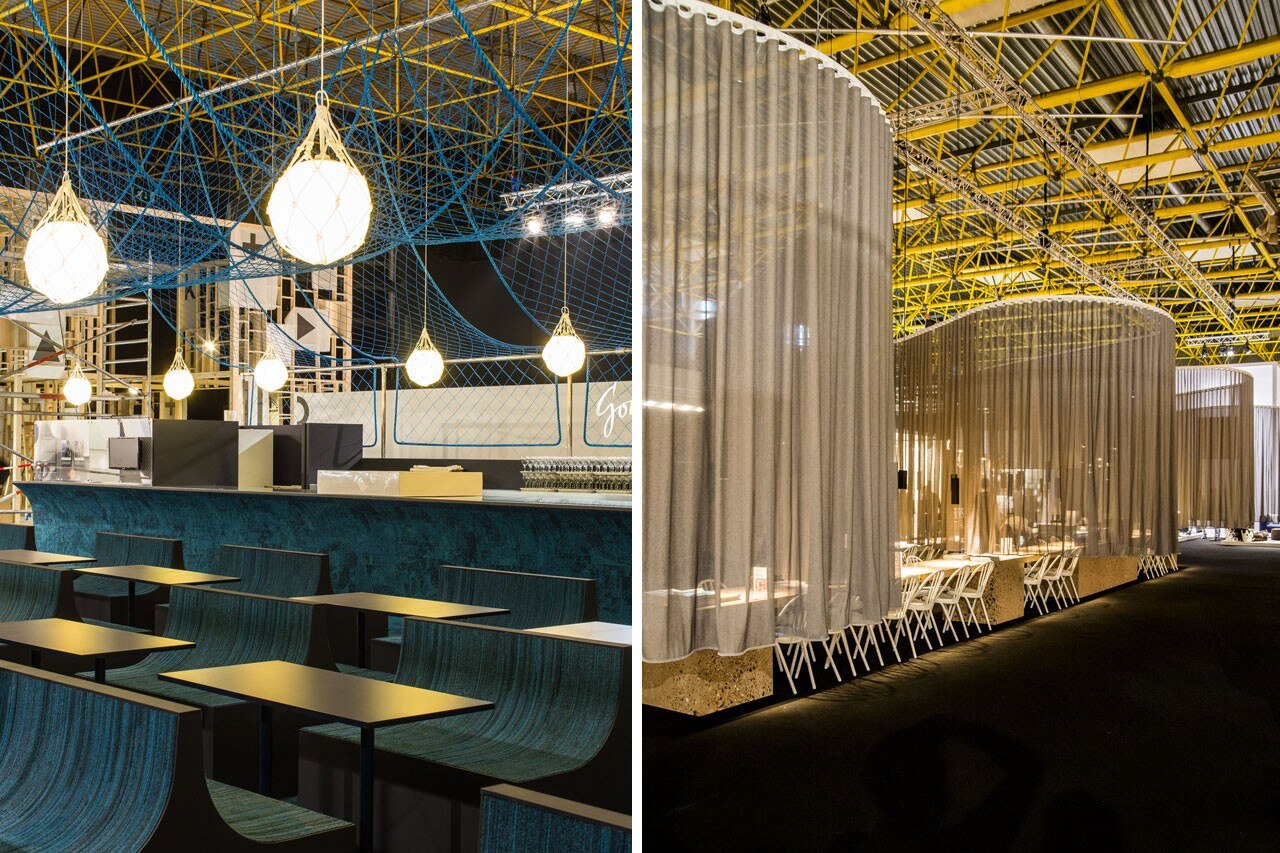 Il bar Gone Fishing – realizzato dal team svedese di Charlotte Ryberg, Fritz Håkon Halvorsen e Marcia Harvey Isaksson – e Behind the Curtain – dei belgi Jasper Stevens e Karel Verstraeten – sono entrambi tra i cinque vincitori degli Interieur Awards (categoria Spaces). Il primo spazio, a sinistra, abbina un linguaggio grafico sottile all’offerta gastronomica di pesce e frutti di mare; mentre il secondo, a destra, offre ai visitatori un momento di fuga dagli stimoli fieristici, nascosti dietro le onde di tessuto morbido che definiscono spazi intimi arredati con lussuosi tavoli di marmo