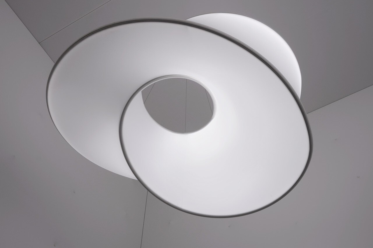 Inifnite Loop è una luce tridimensionale volumetrica, creata dalla sinergia tra il materiale stretch, l’illuminazione a LED e la struttura in metallo. Il telaio in alluminio è costruito da un unico anello di metallo continuo, che contiene la striscia di LED, e dal rivestimento in tessuto Barrisol, che crea una forma simile al nastro di Moebius.