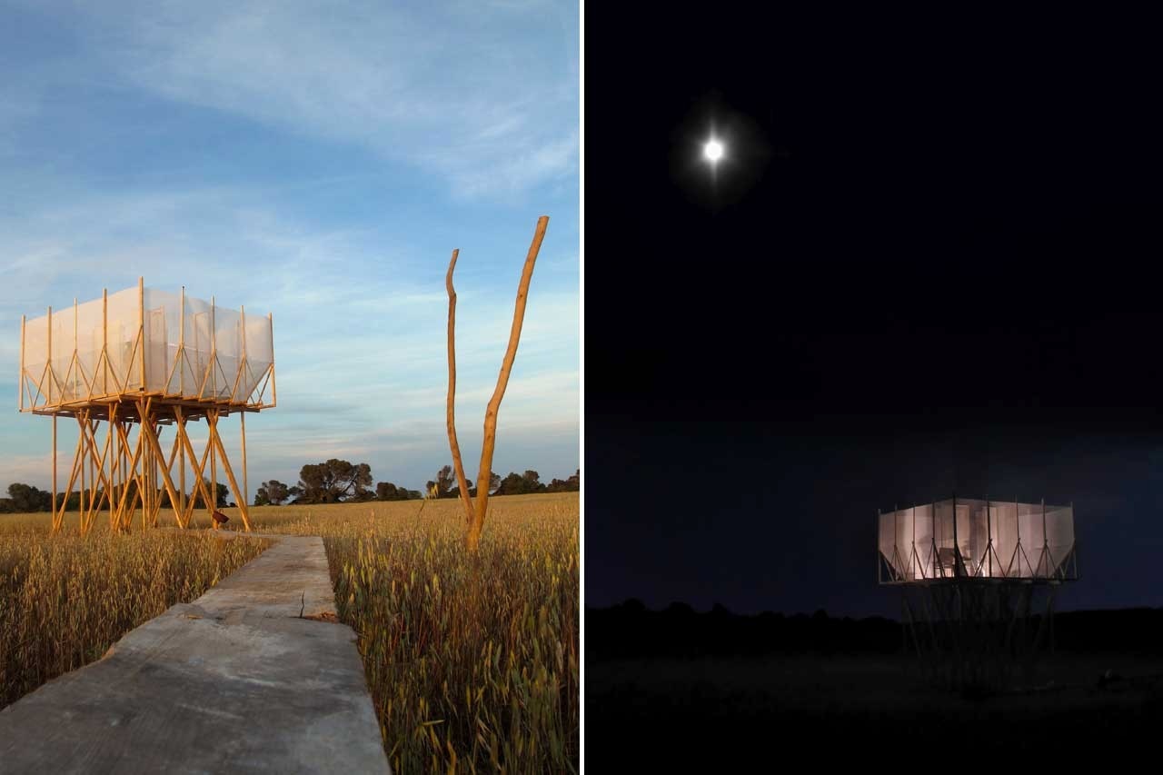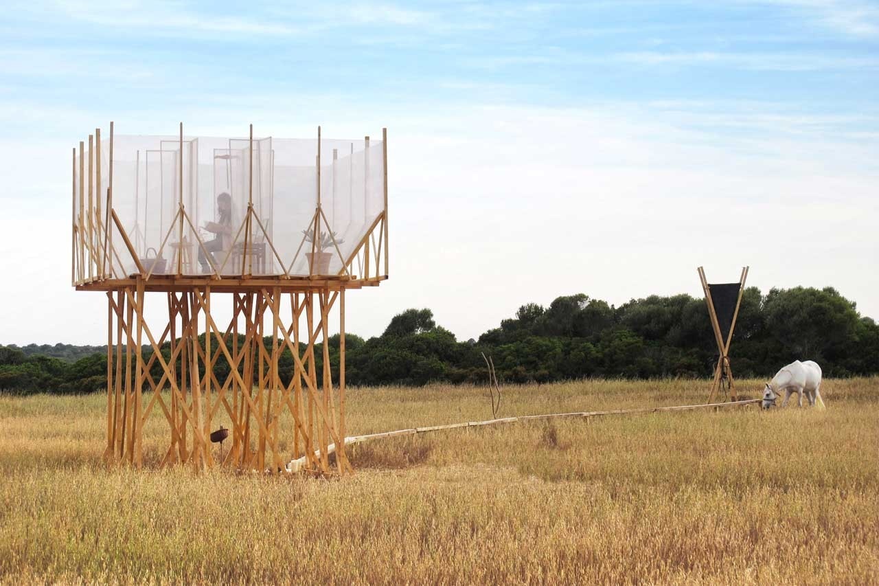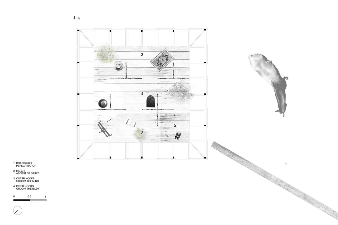 Lo spazio minimo (3x3 metri), funziona come un rifugio per la depurazione personale. La struttura, realizzata in legno locale, è sopraelevata per godere della vista, pur facendo sentire l’utente protetto dalle reti, sovrapposte in più strati quando è necessaria una maggiore privacy.