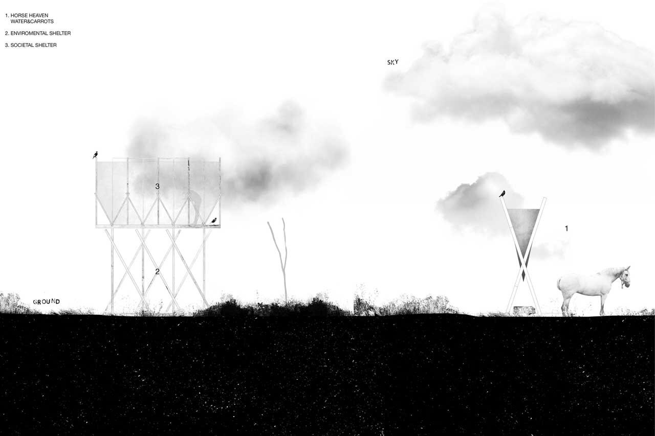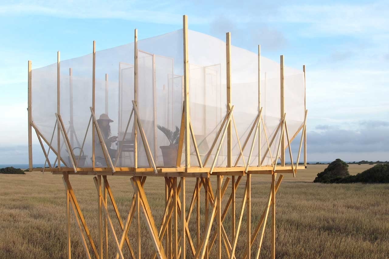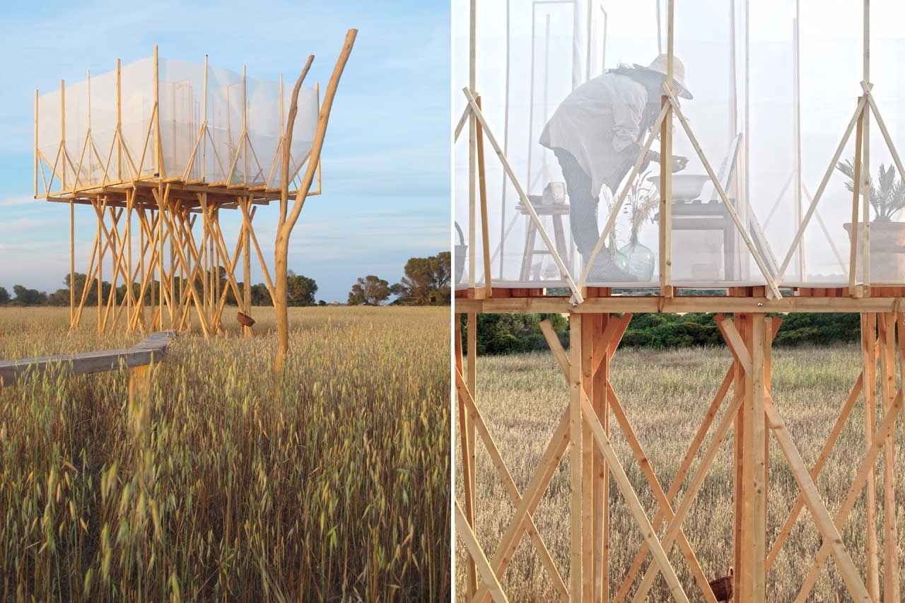 Lo spazio minimo (3x3 metri), funziona come un rifugio per la depurazione personale. La struttura, realizzata in legno locale, è sopraelevata per godere della vista, pur facendo sentire l’utente protetto dalle reti, sovrapposte in più strati quando è necessaria una maggiore privacy.