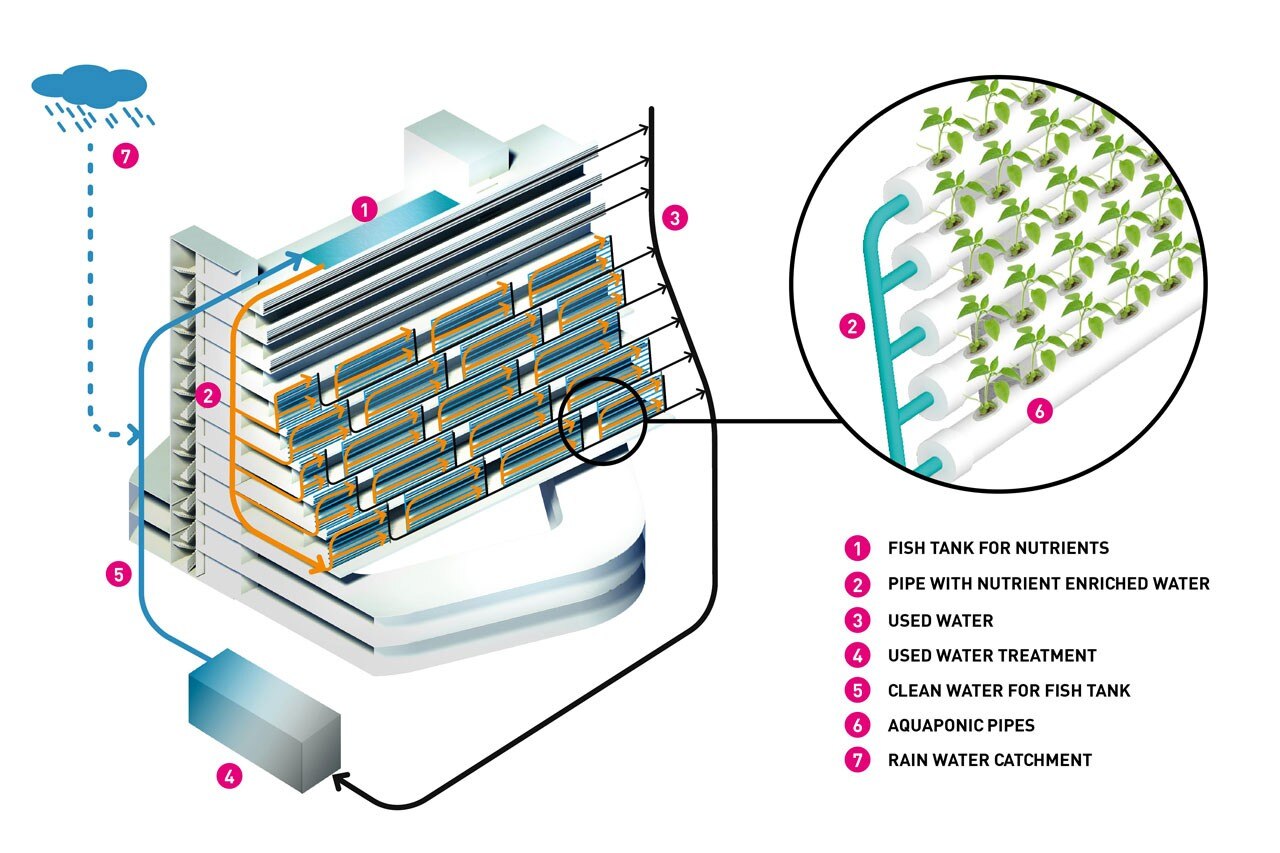 La sostenibilità ambientale e l’efficienza di Home Farm sarebbero migliorate dalle caratteristiche proposte, come la raccolta di acqua piovana per l’impiego nel sistema idroponico e l’uso dei rifiuti organici per la produzione di energia.