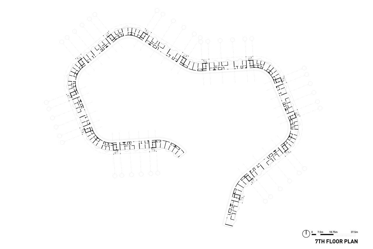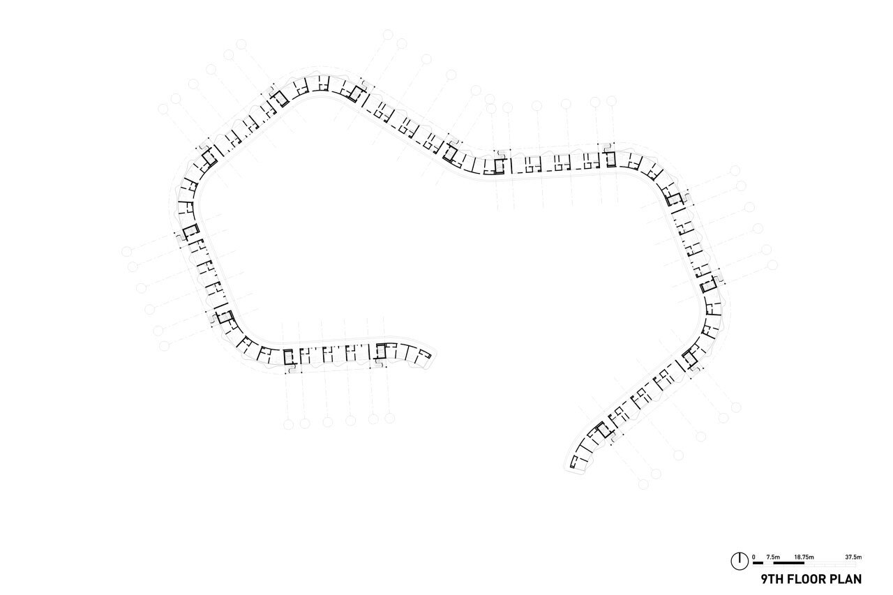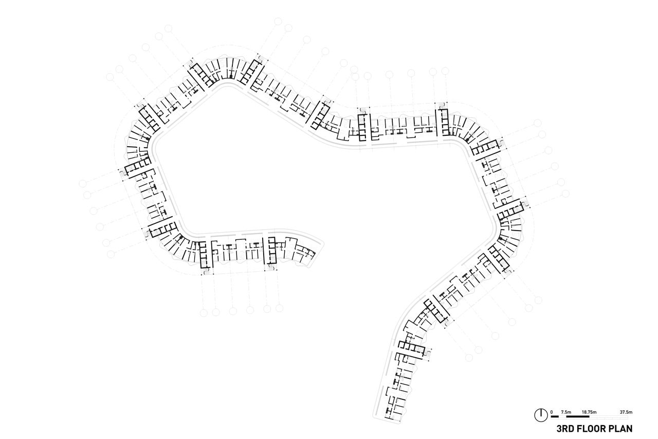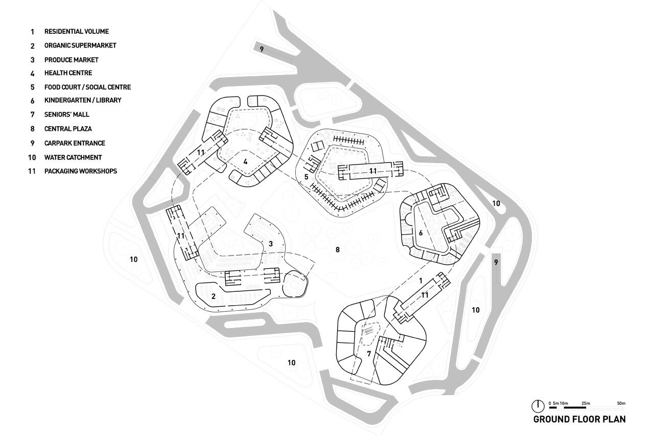 I residenti possono combattere le preoccupazioni economiche lavorando part-time alle coltivazioni, sotto la direzione di un team di agricoltori professionisti. I servizi necessari a rispondere alle esigenze di una popolazione più anziana occupano i piani inferiori dell’edificio (e sono aperti al pubblico), mentre gli alloggi sono distribuiti ai livelli superiori del volume curvilineo che ricorda l’orografia del terreno.