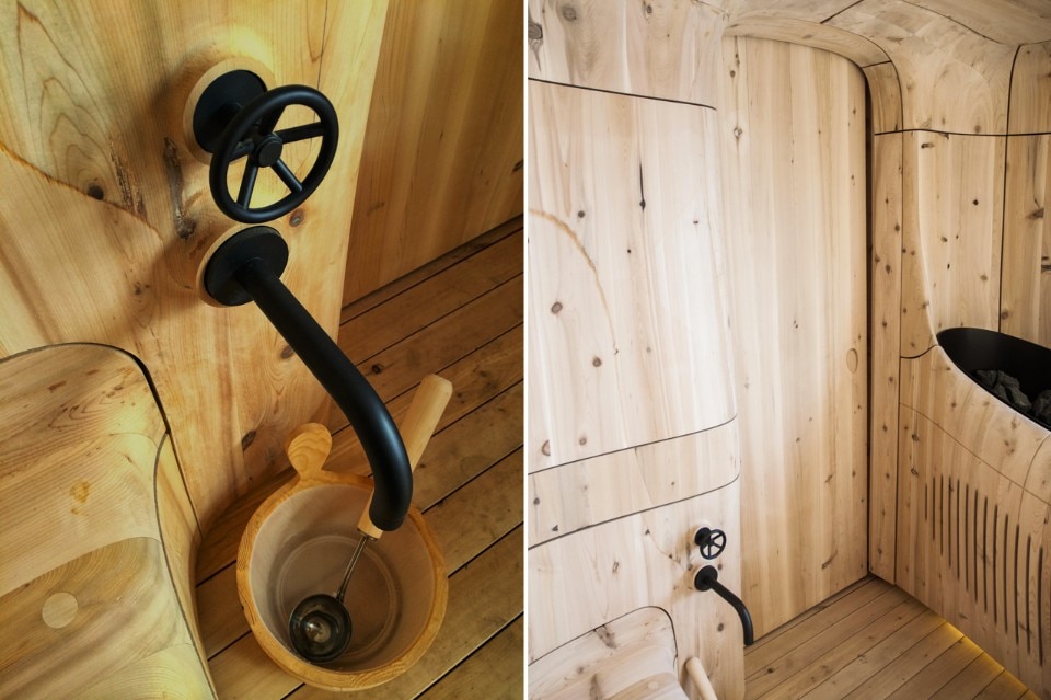 Il progetto prevede una presenza semplice e solida all’esterno, mentre l’interno è costituito da forme curve e dinamiche. Gli architetti di Partisans hanno sperimentato le proprietà del legno per sviluppare un nuovo processo di fabbricazione, utilizzando la tecnologia 3D per la scansione, la modellazione e la costruzione della sauna.