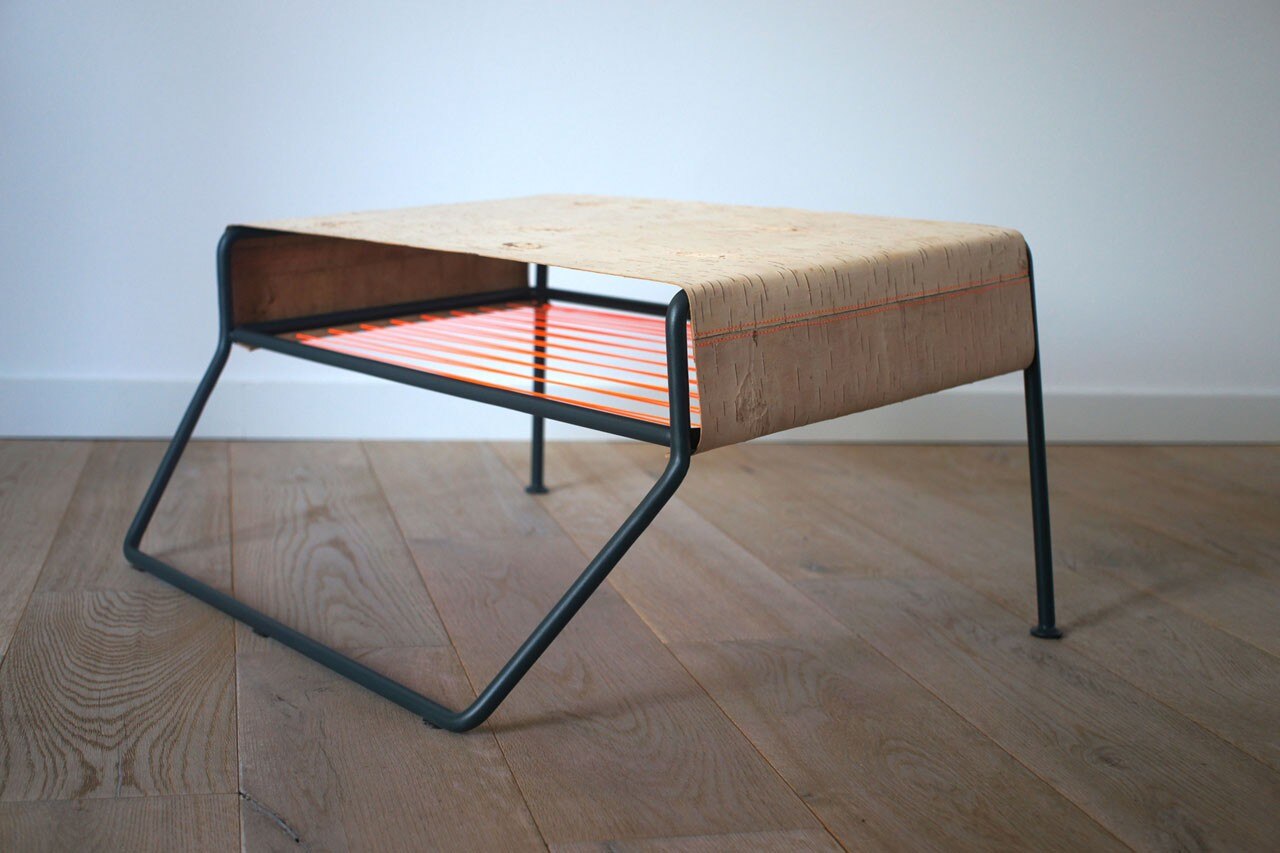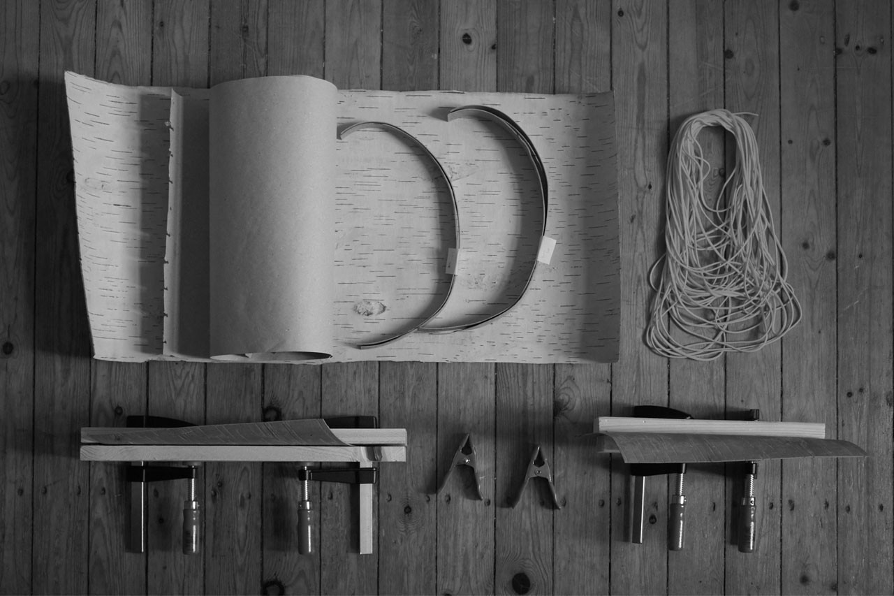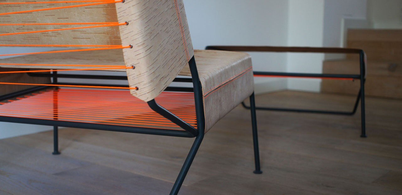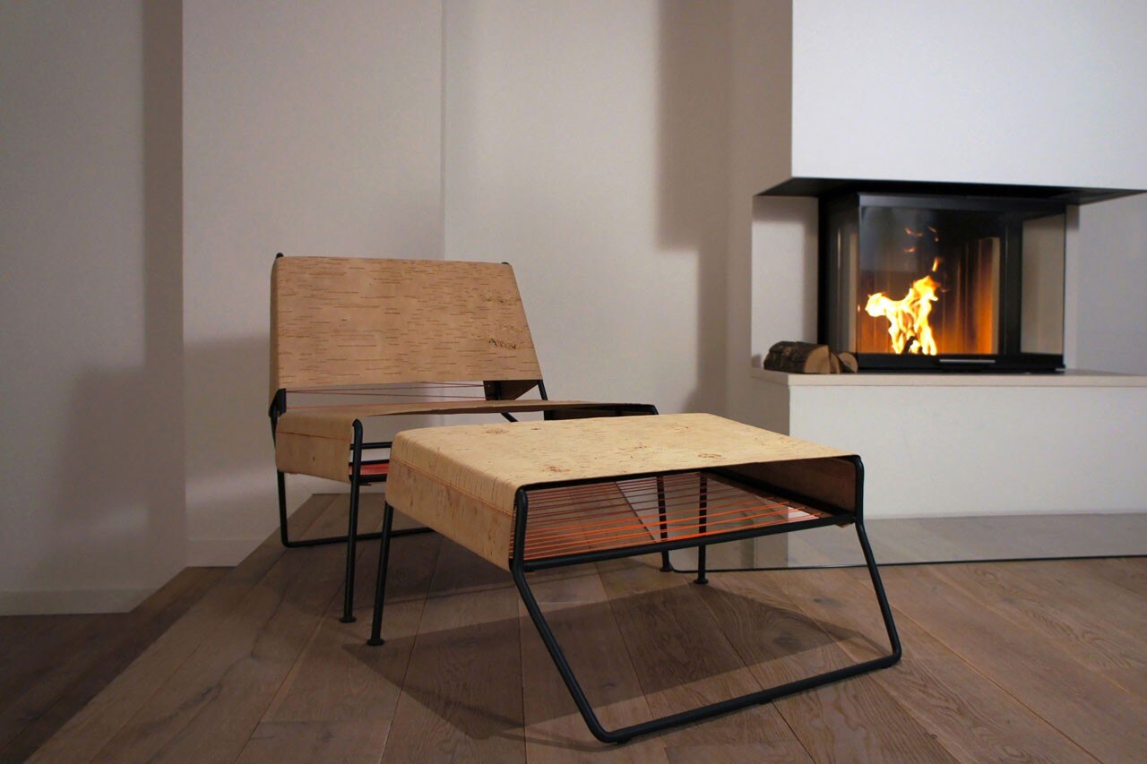 La combinazione di poltrona e pouf sottolinea l’estetica dei materiali, unendo le competenze tradizionali con processi moderni. L’allineamento orizzontale della corteccia ne sottolinea le proprietà simili alla pelle e offre una seduta ampia e confortevole. I dettagli tessili e la cornice geometrica ridotta creano un netto contrasto con la corteccia di betulla naturale.