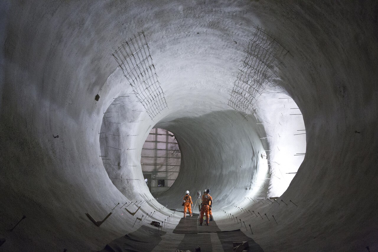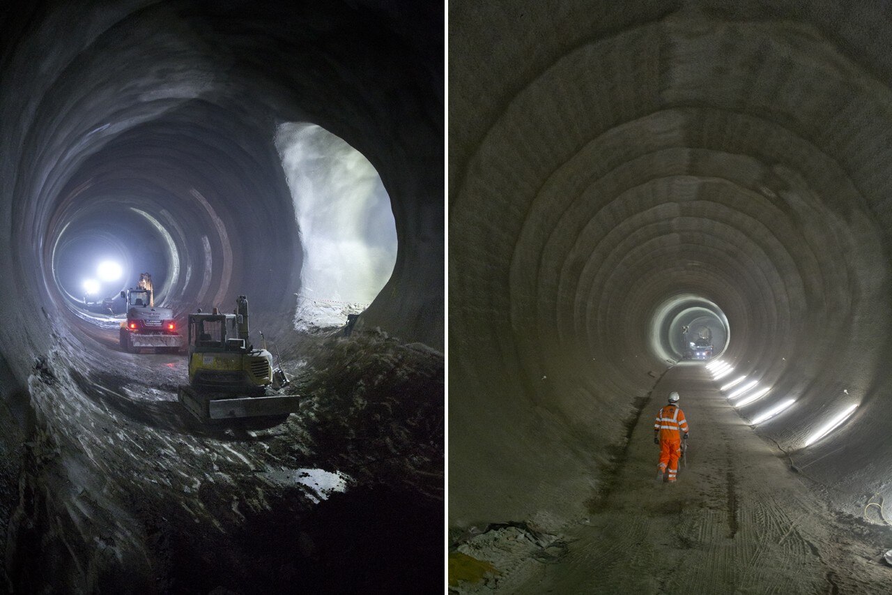 A sinistra: Macchinari nelle nuove gallerie per la stazione di Liverpool Street. Più di 1,5 chilometri di piattaforme e di tunnel pedonali tunnel sono stati creati a oltre 40 metri sotto il livello del suolo. Photo courtesy Crossrail. A destra: Gallerie a Tottenham Court Road. Accanto alla riqualificazione della stazione della metropolitana esistente, Crossrail sta costruendo una nuova stazione della grandezza di tre campi da calcio, su quattro piani sotto terra. Più di 200.000 passeggeri utilizzeranno Tottenham Court Road dal 2018. Photo courtesy Crossrail