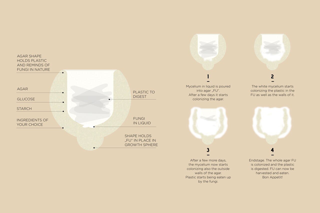 Fungi è coltivato in un sistema di agar agar progettato appositamente che i progettisti hanno chiamato FU, riempito di materiali plastici. L’agar agar è un polisaccaride usato come gelificante naturale e ricavato da alghe rosse.