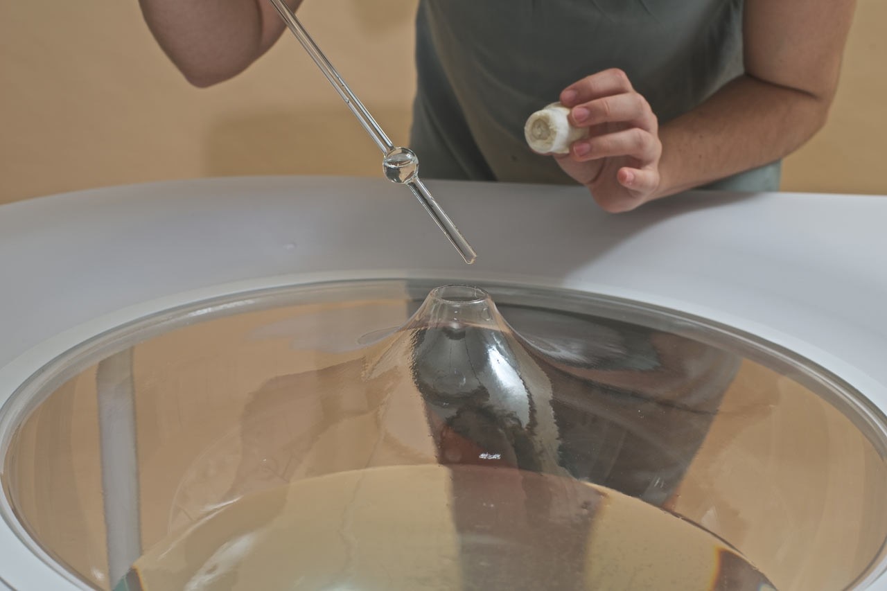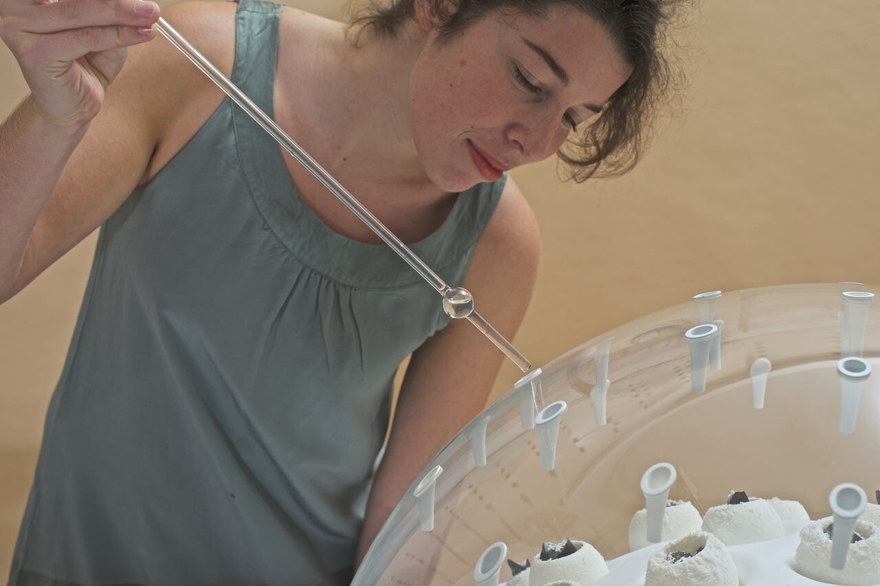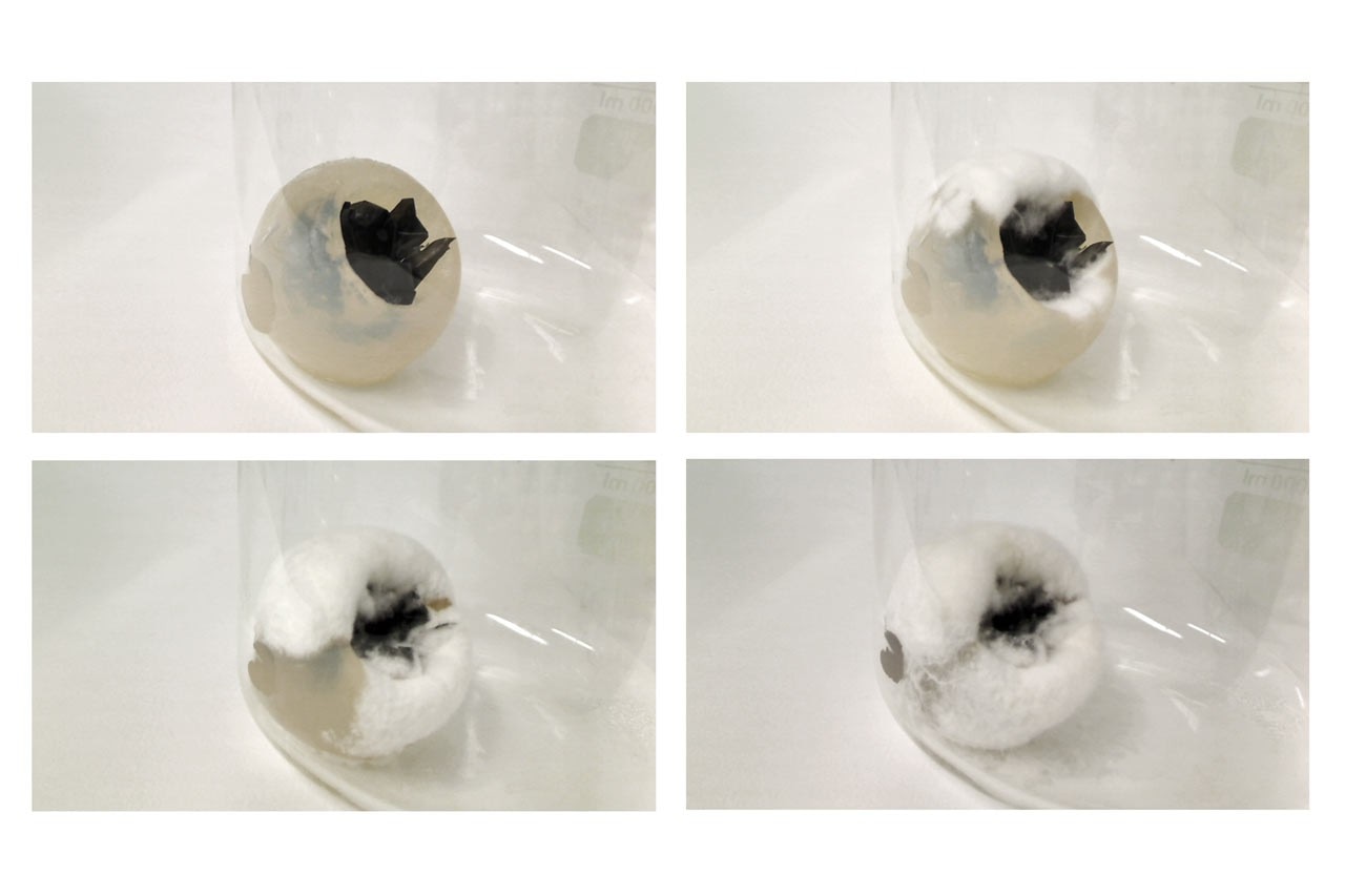 I funghi vengono inseriti nel prototipo, digeriscono la plastica e crescono in tutto il substrato. La forma di FU è progettata in modo da contenere la plastica e da offrire ai funghi molta superficie per crescere.