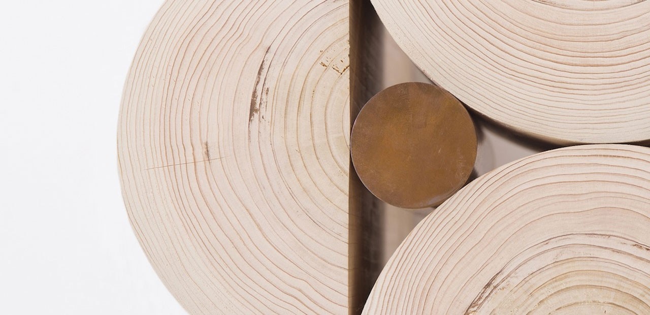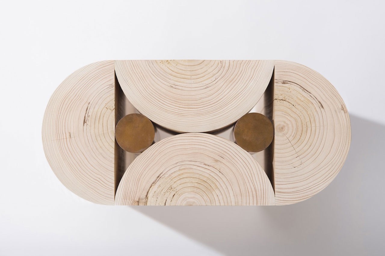L’asta rotonda di rame agisce come un giunto per il collegamento di ogni metà del tronco, sottolineando il punto di tangenza dei due materiali diversi con un raccordo geometrico.