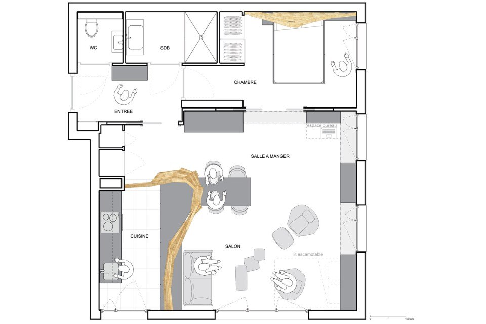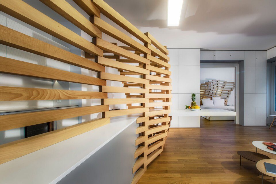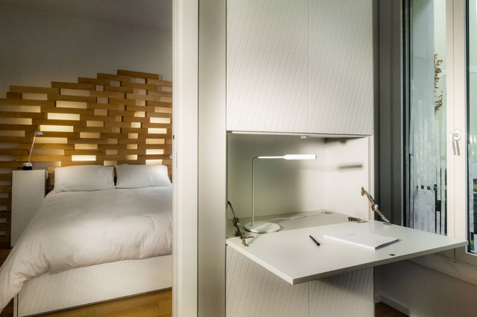 Lo spazio è inoltre massimizzato integrando gli armadi nelle pareti (tra cui un letto pieghevole e una scrivania). Un armadietto a tutta altezza, di nuovo su misura, movimenta lo spazio. “Questa tecnica permette di creare un materiale unico. Le scanalature millimetriche si rivelano in misura diversa durante la giornata a seconda del gioco di luci e ombre. Le linee grafiche alleggeriscono la massa dei mobili, rafforzando le grandi superfici bianche” spiega Coudamy.