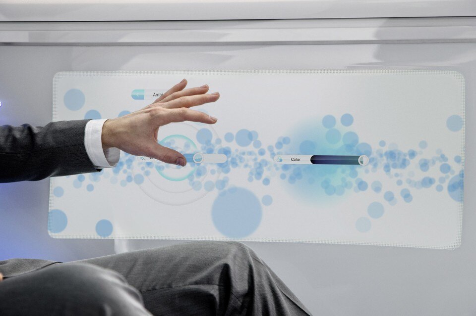 I passeggeri possono interagire intuitivamente con i sistemi di bordo mediante gesti, “eye-tracking” oppure toccando gli schermi ad alta definizione. I sensori riconoscono le mani dei passeggeri e offrono loro interfacce comodamente accessibili presentando le opzioni di volta in volta adeguate alla situazione. Flussi di particelle sui display visualizzano il movimento della vettura.