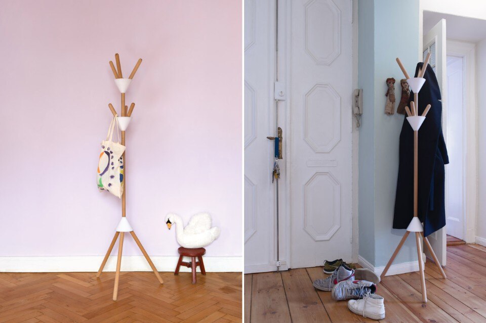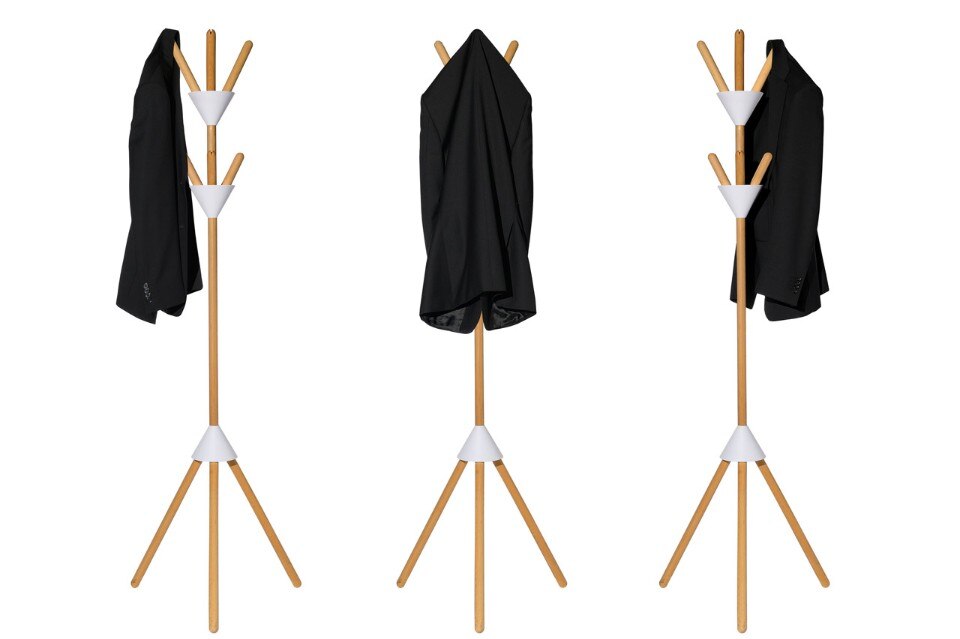 La stabilità è garantita dall’allineamento delle tre gambe con i sei elementi che fungono da appendiabiti. Ogni elemento di sostegno può essere caricato fino a cinque chili. Pierrot è realizzato in legno di faggio e proposto in due versioni: con gli elementi di snodo in colore bianco oppure grigio.