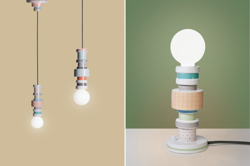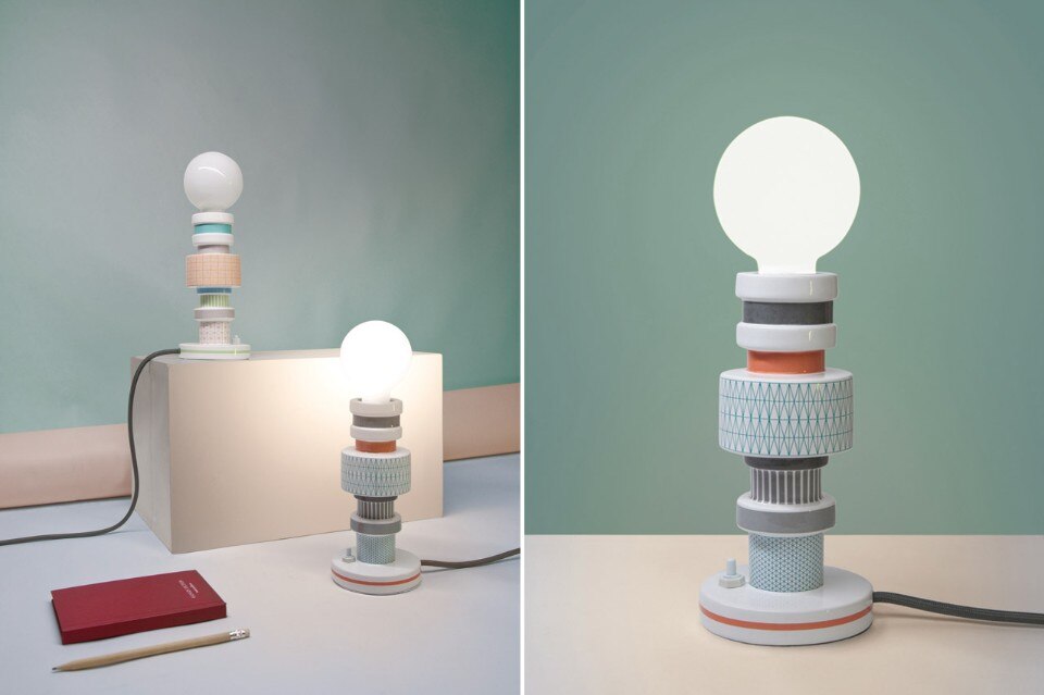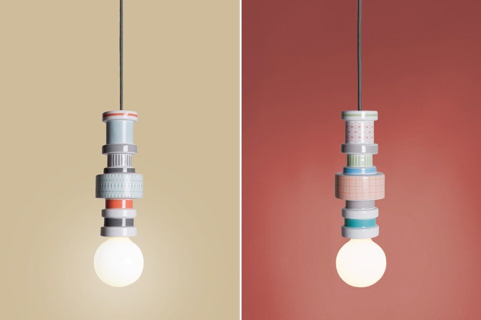Corpi illuminanti dai volumi compatti e dalle geometrie decise rivelano – tatuate in superficie – fantasie di colori e sottilissime filigrane policrome: lungo il diffusore di luce, realizzato in porcellana nella variante di colore bianco, esili arabeschi dalle membrature architettoniche si alternano a fasce di colore dal timbro deciso, in un dinamico susseguirsi policromo di linee stilizzate, nei toni pastello dell’arancio bruciato, indaco, turchese, verde pistacchio e grigio.