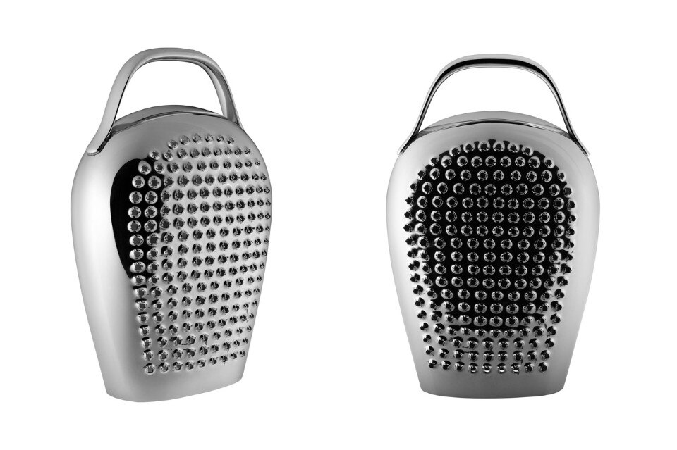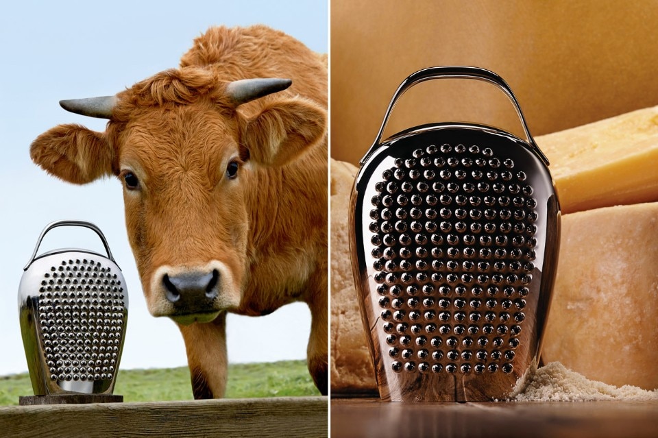 Gabriele Chiave e Lorenza Bozzoli hanno disegnato per Alessi un campanaccio – di quelli che si appendono al collo delle mucche – per grattugiare il formaggio.