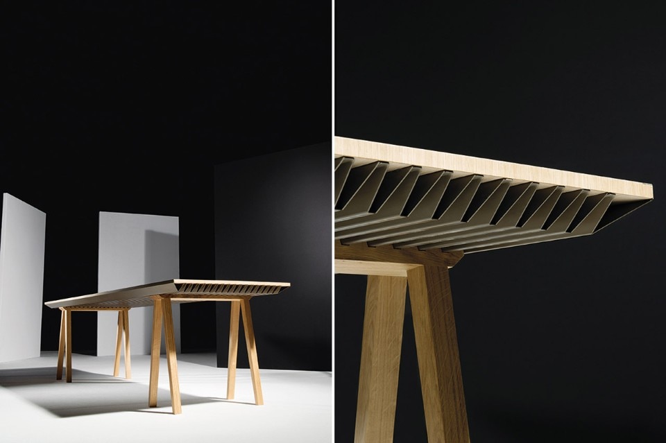Clavicula Corpus è un tavolo con piano a sbalzo che assicura il massimo comfort per lo studio e il lavoro. Le cinghie in pelle abbinate al legno costituiscono la base e la parte inferiore del plateau, tendendo la struttura. Il cuoio è usato anche per coprire il piano e formare una superficie da scrivania.