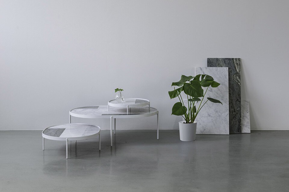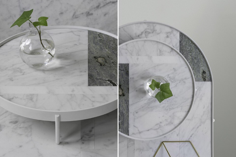 Più tardi, lo stesso giorno, Note Design Studio e Norm Architects si sono incontati a Milano e hanno discusso sulla bellezza delle qualità casuali del pavimento – che si trova anche nella tradizionale architettura di paesaggio giapponese – trasformandola in un’idea di prodotto per l’azienda Menu. Il risultato del progetto sono tre tavoli, che vanno dalle dimensioni di un tavolino da salotto a quelle di un grande vassoio. L’ispirazione del pavimento si è tradotta in una superficie decorativa composta da diverse lastre di marmo che rendono i tavoli Patch unici, pur nella loro industrialità.