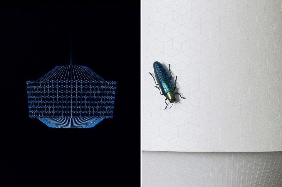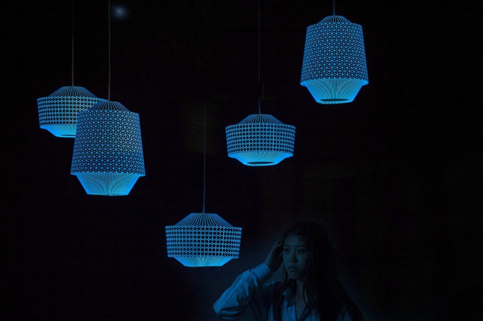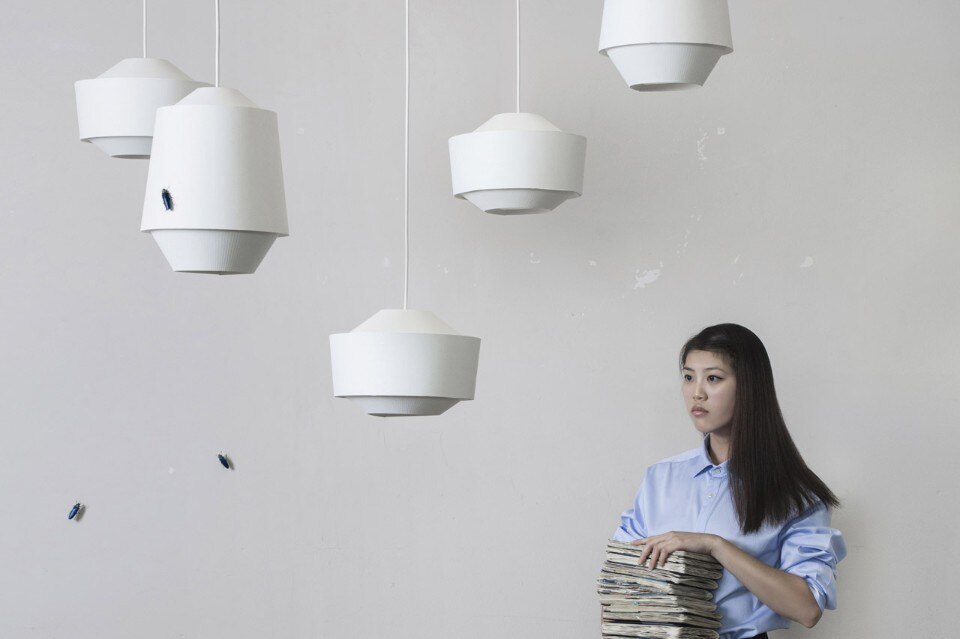 È ispirata alle lanterne cinesi questa lampada, progettata da Ontwerpduo con un paralume in carta serigrafata che si carica con la luce del giorno e della lampada stessa.