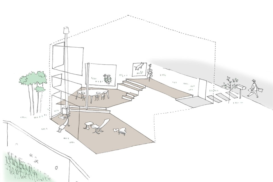 Il piano crea un senso di espansione spaziale abbassando gradualmente il livello del pavimento, sfruttando il dislivello di 1,4 metri del sito. Ogni differenza di livello dei piani è stata impostata in modo da poter essere usata anche come seduta.