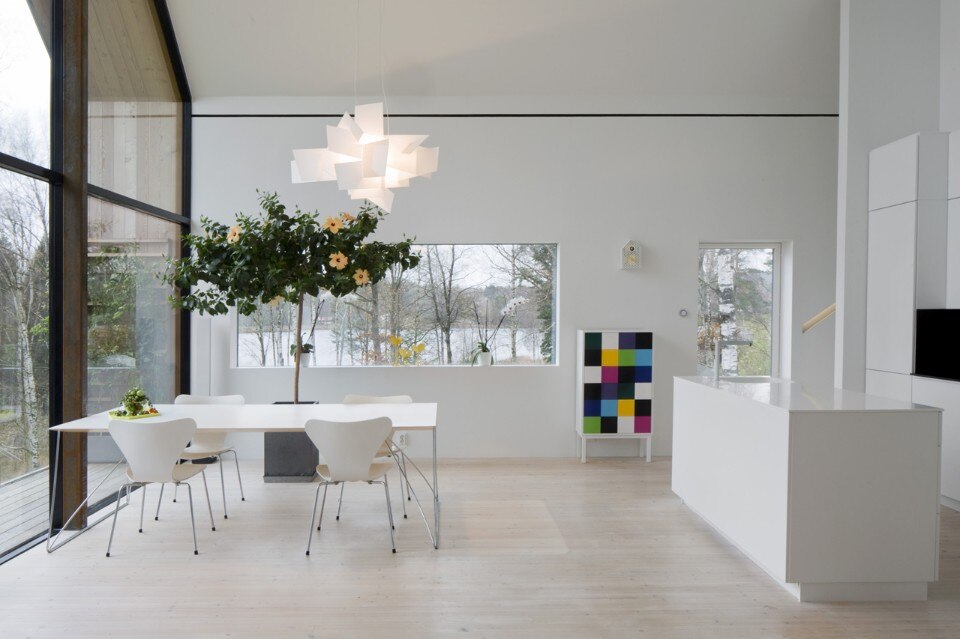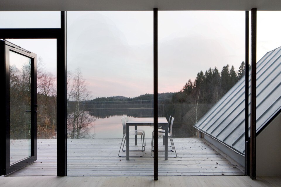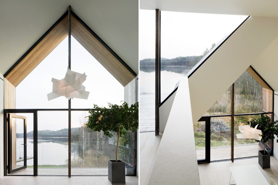 All’interno tutto lo spazio si apre sulla vista mozzafiato: il volume a capanna ospita la cucina, affacciata sul lago e sul bosco. Gli interni minimalisti e senza soluzione di continuità sono tutti giocati sul contrasto tra bianco e nero.